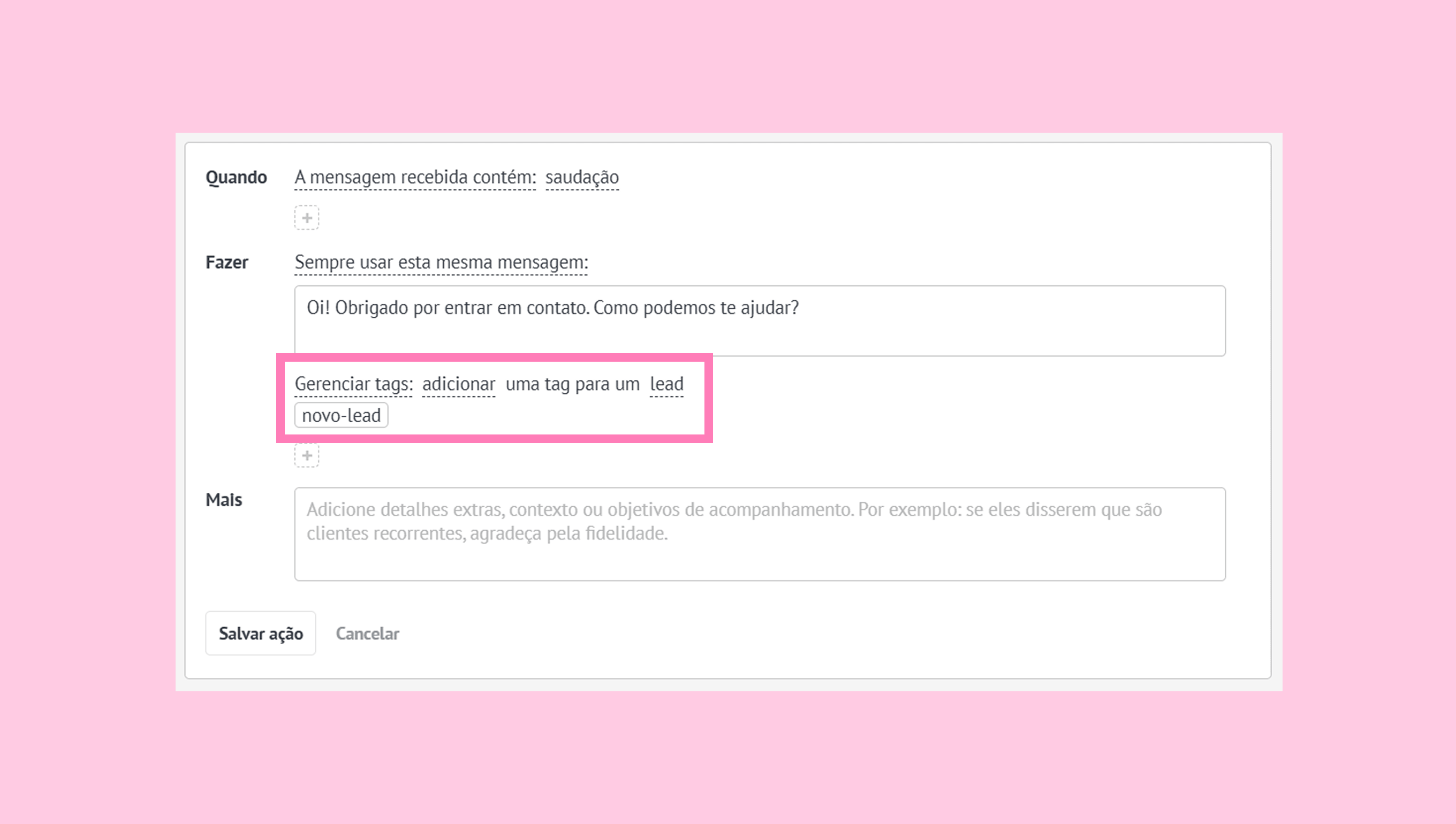 Você também pode adicionar outras ações como Gerenciar tags e adicionar uma tag ao lead recebido, como novo-lead.