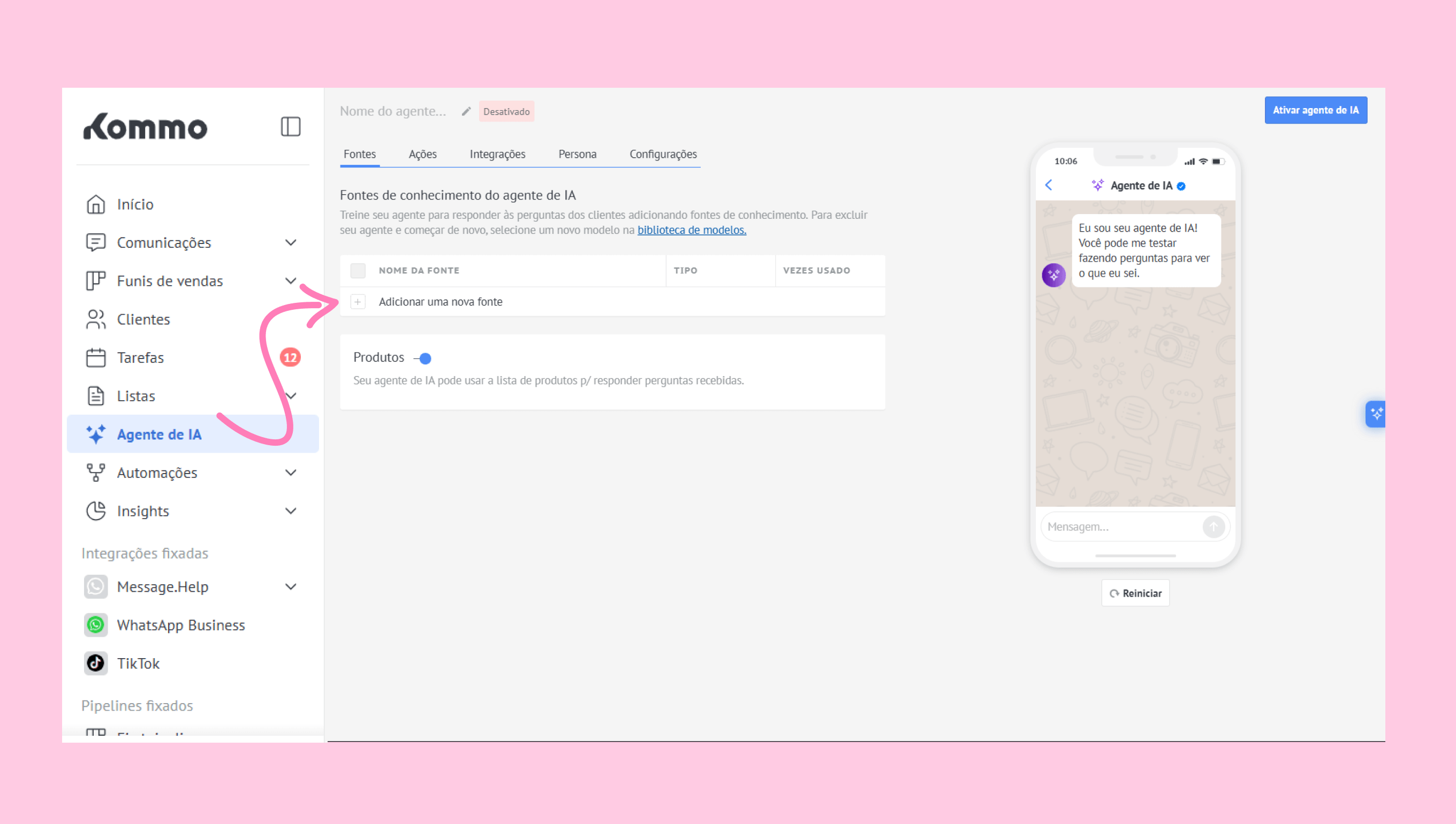 Este guia mostra como configurar o agente de IA manualmente, entender como suas subfuncionalidades funcionam e prepará-lo para trabalhar em sua área de trabalho Kommo.