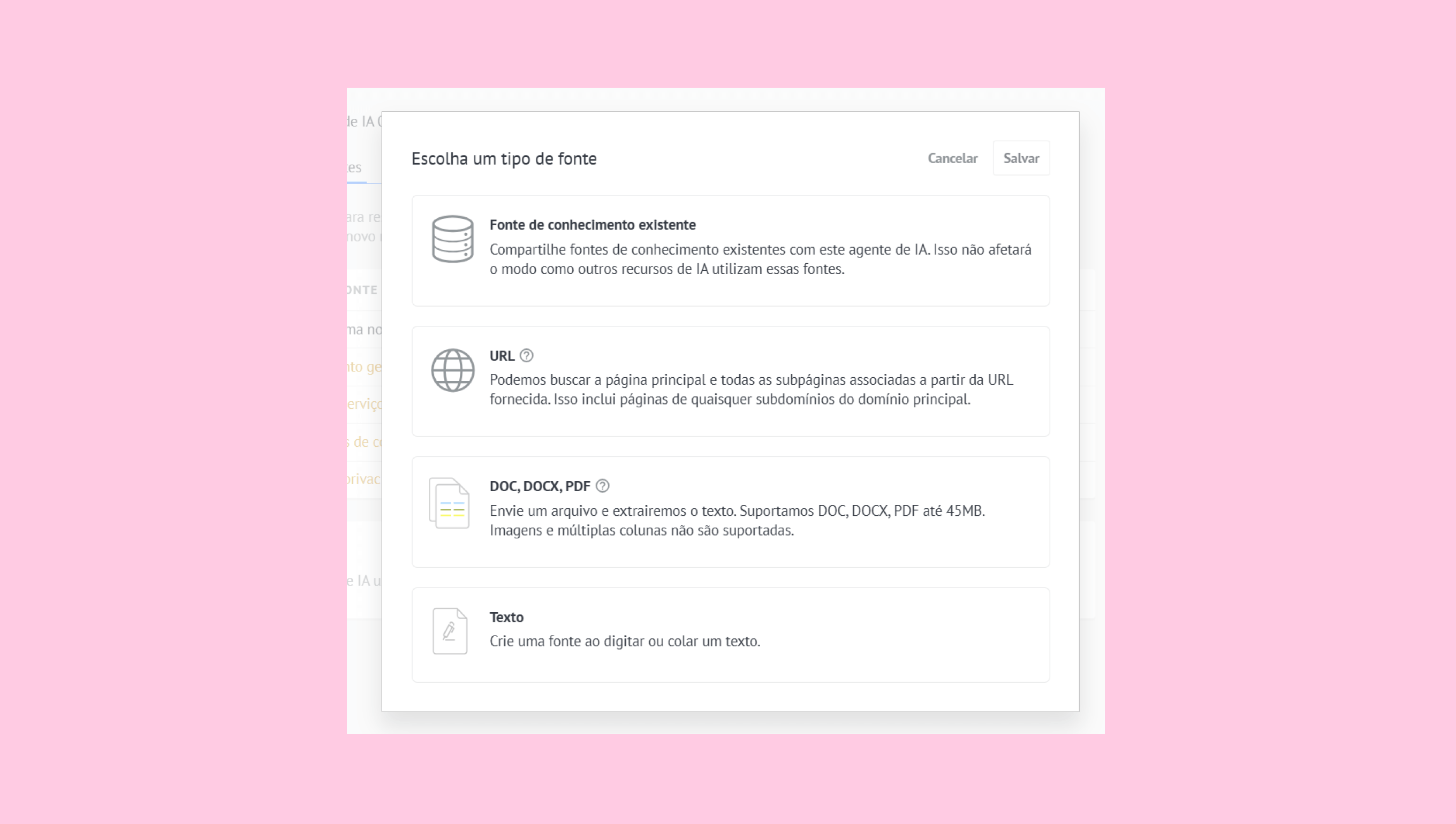 Observação: Para selecionar uma fonte que já foi carregada anteriormente, clique em Fonte de conhecimento existente. Não há limite para o número de fontes carregadas que podem ser vinculadas ao Agente de IA.