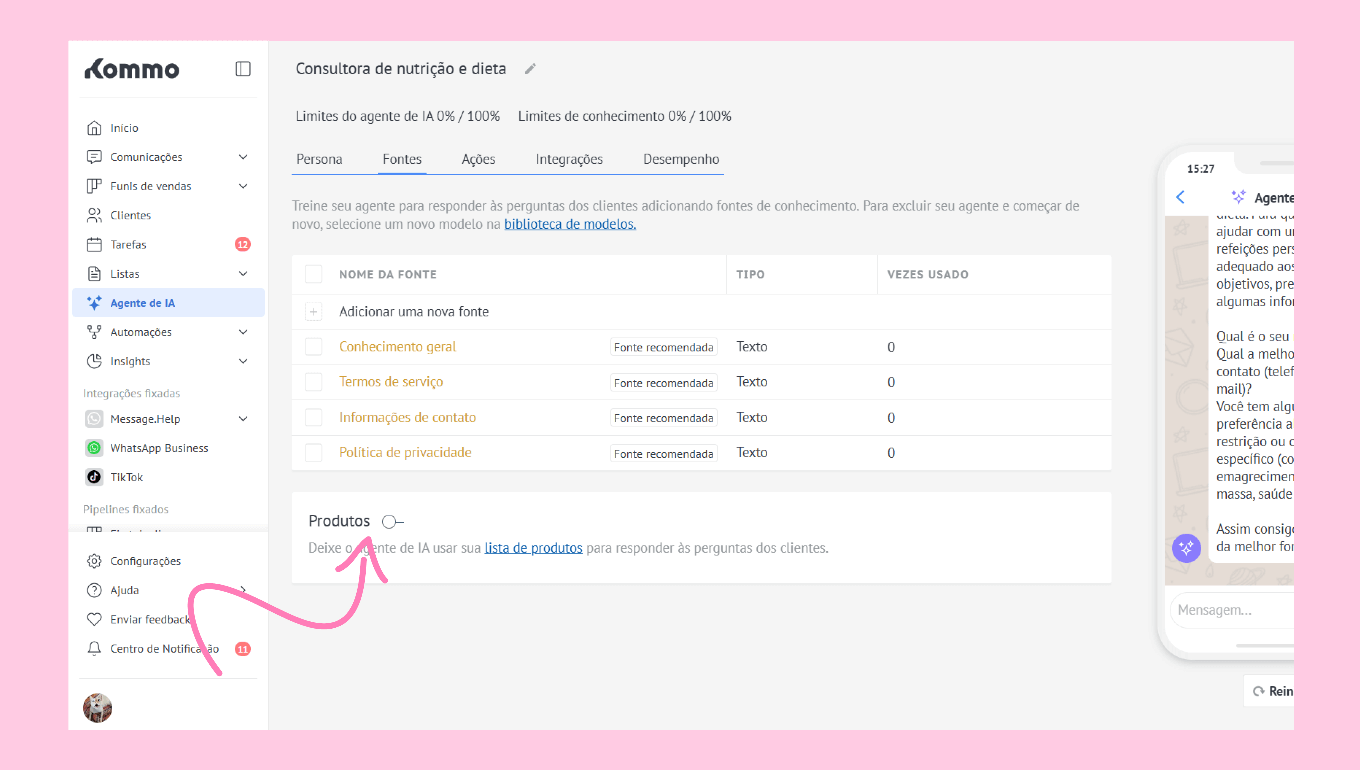 Após adicionar todas as fontes, ative a opção Produtos para permitir que o agente de IA acesse as informações do seu catálogo de produtos.