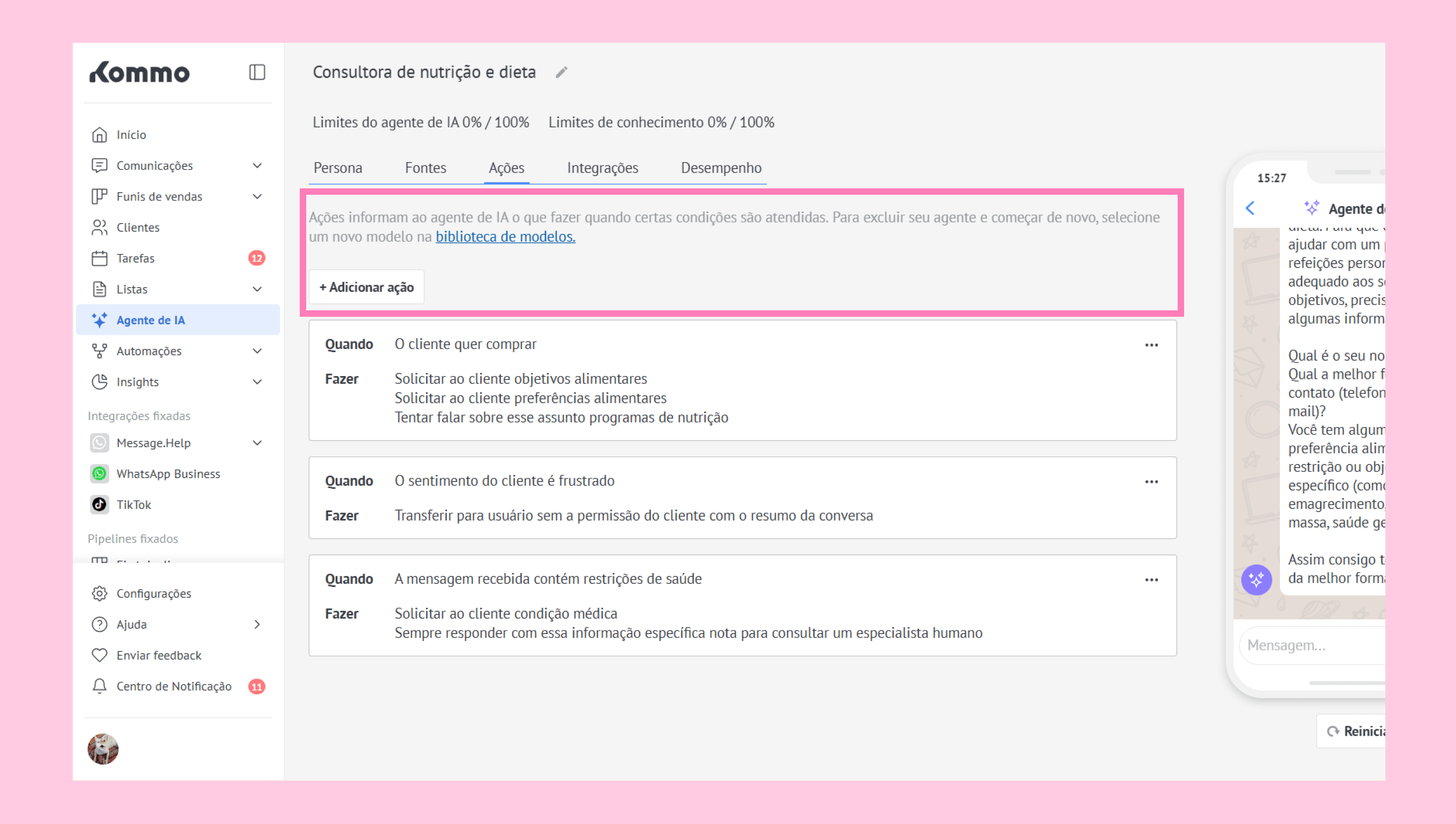 O agente de IA pode se ajustar automaticamente com base na situação.