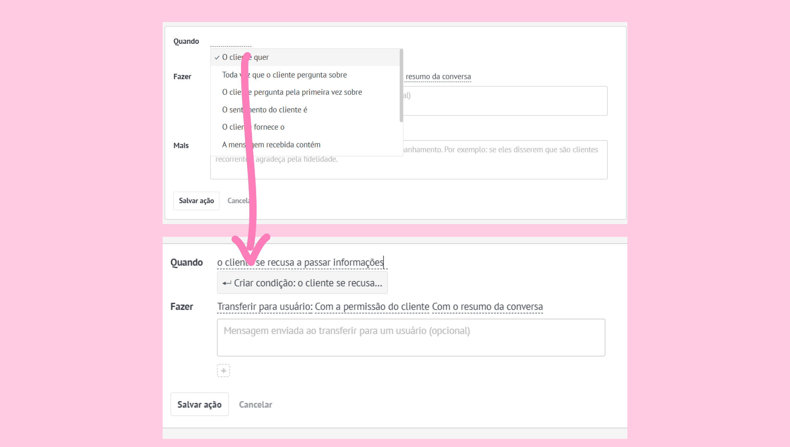 Uma ação pode ter até 5 condições QUANDO. Você pode escolher entre as opções sugeridas ou criar as suas próprias digitando e salvando uma opção personalizada em qualquer campo QUANDO.