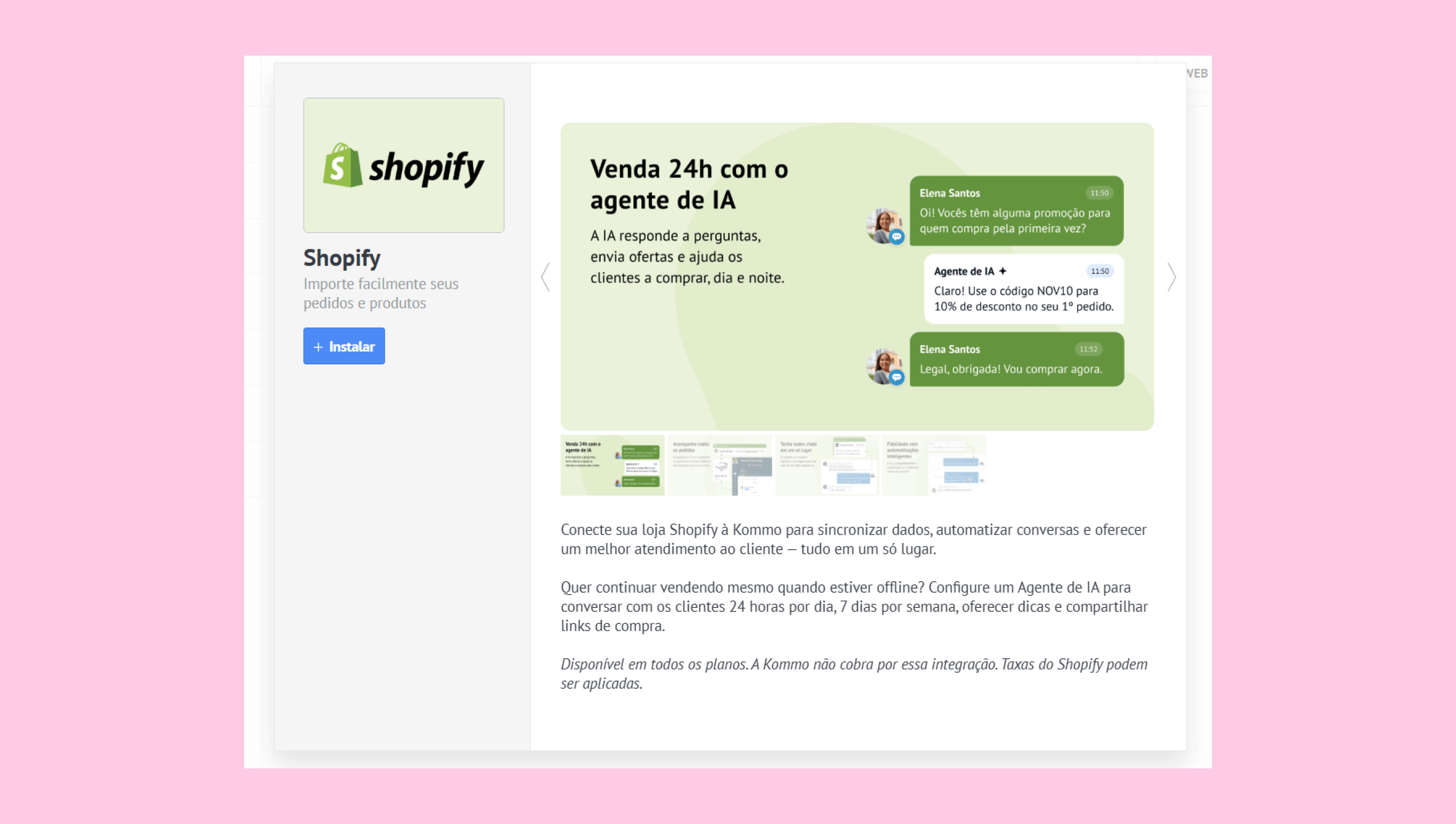 Clique na aba Integrações. Clique em Instalar na caixa do Shopify.