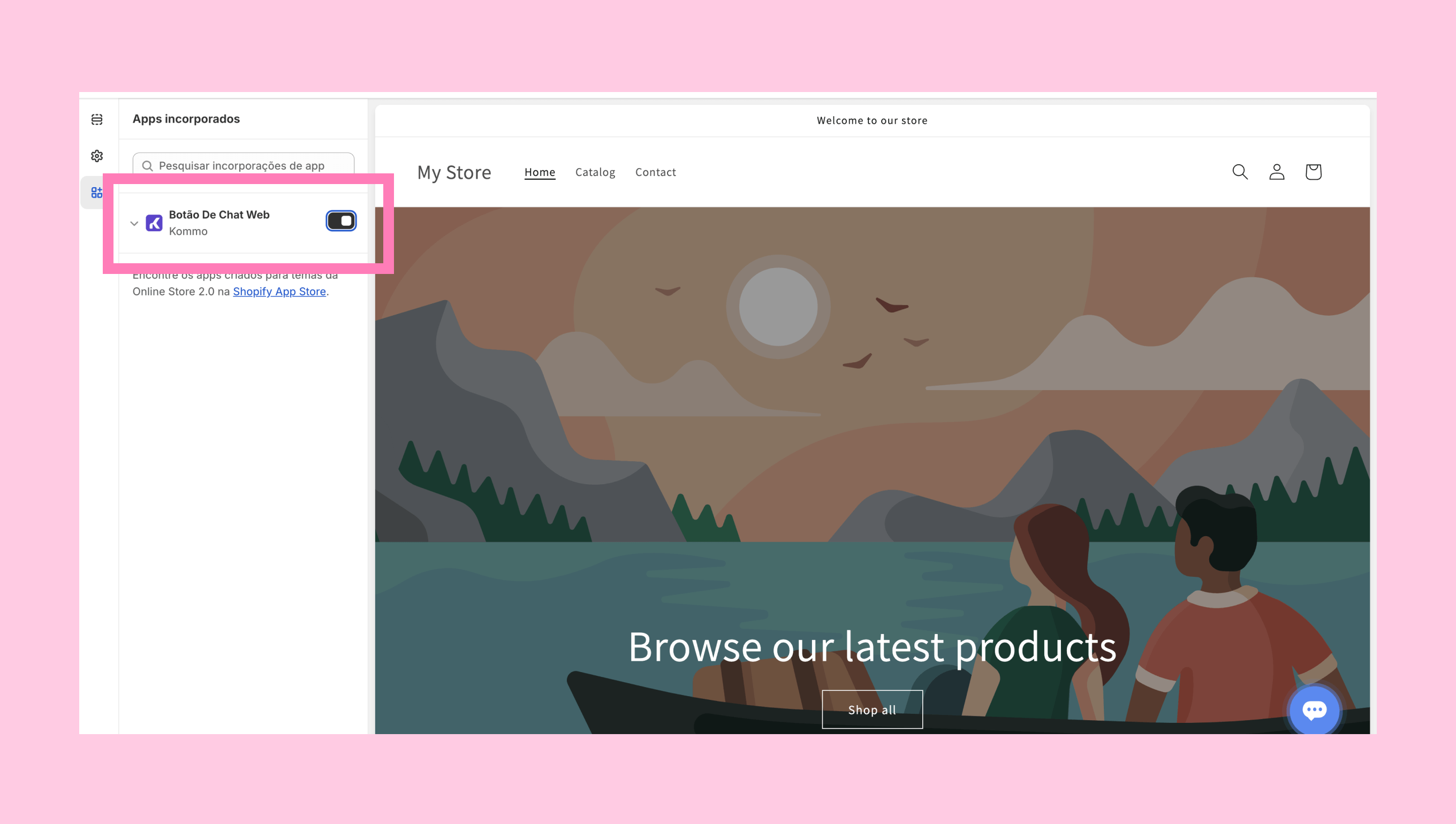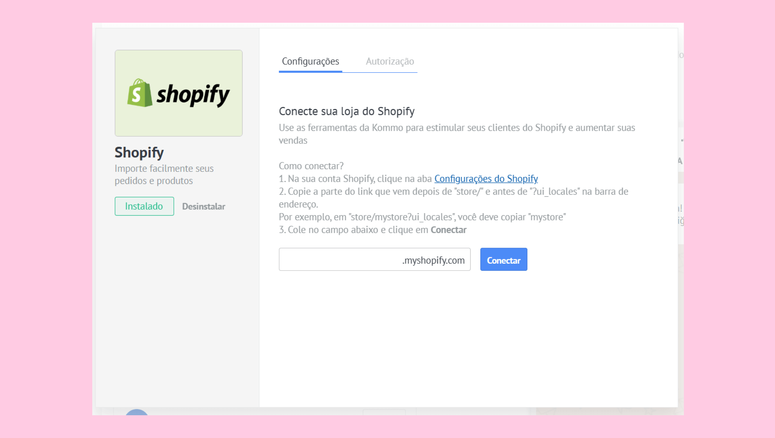 Volte à Kommo e clique em Acessar minha loja Shopify para continuar a configuração.