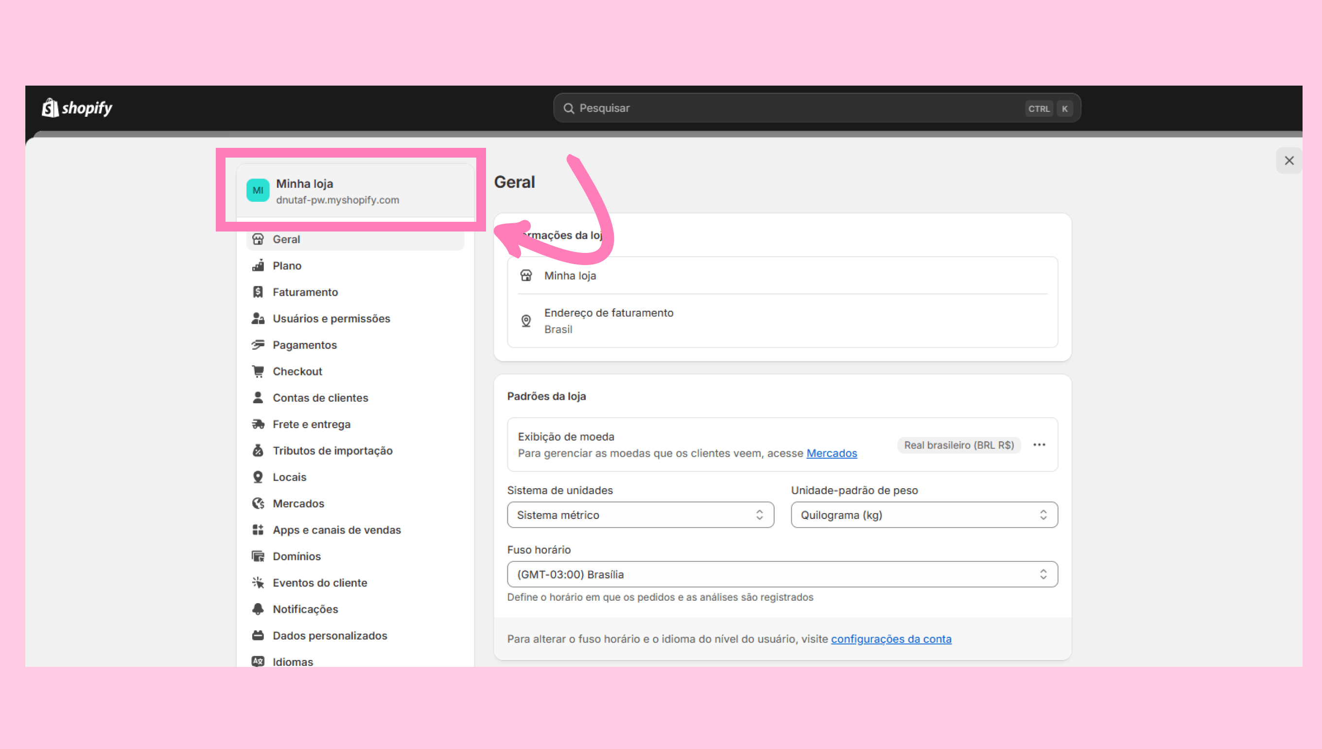 Acesse as configurações da sua loja Shopify. Copie o domínio listado abaixo do nome da sua loja (por exemplo, 9bb49f-c6.myshopify.com) e cole-o na janela modal de integração. Clique em Conectar para concluir a integração.