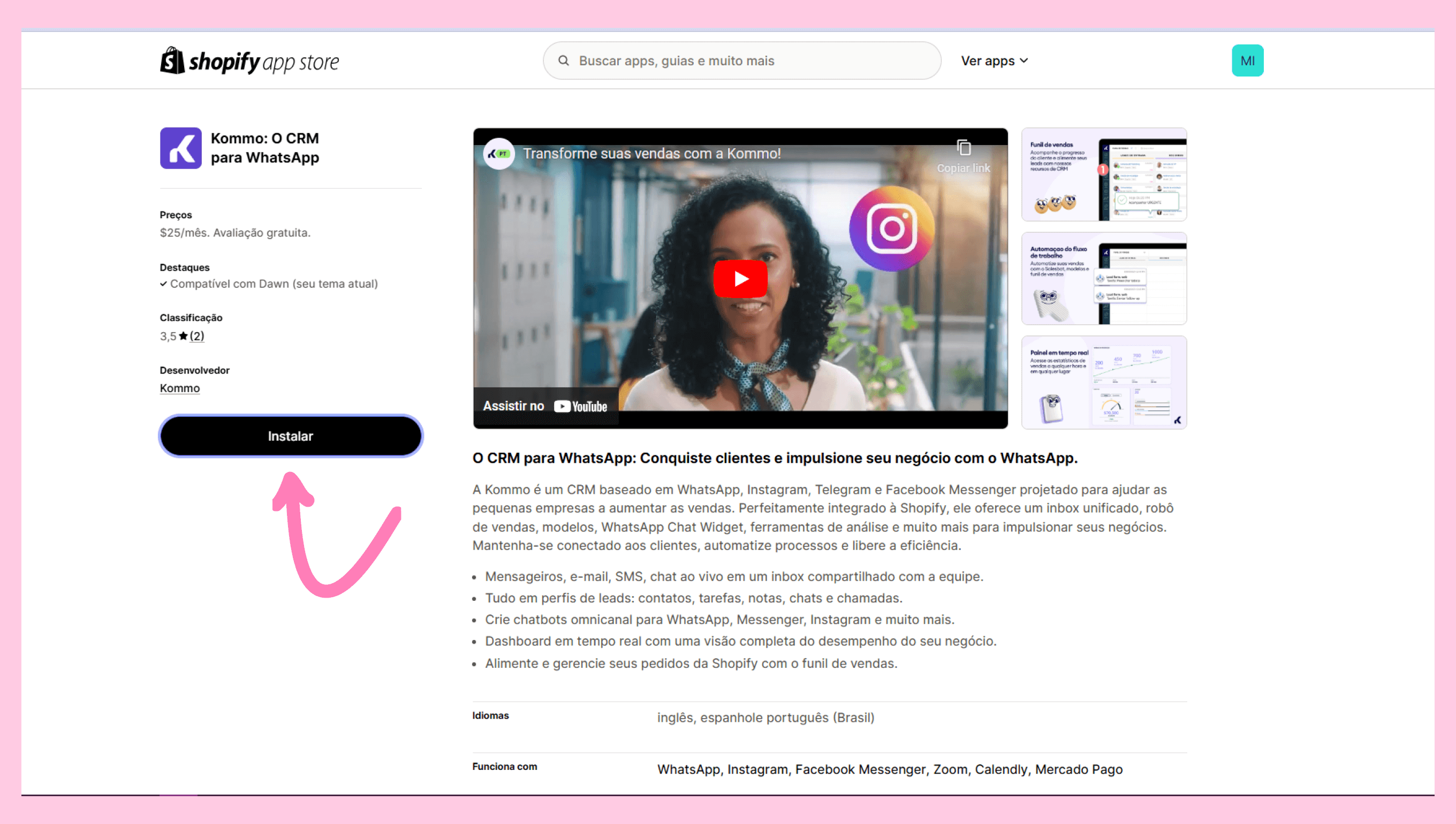 Procure por Kommo e clique em Instalar.