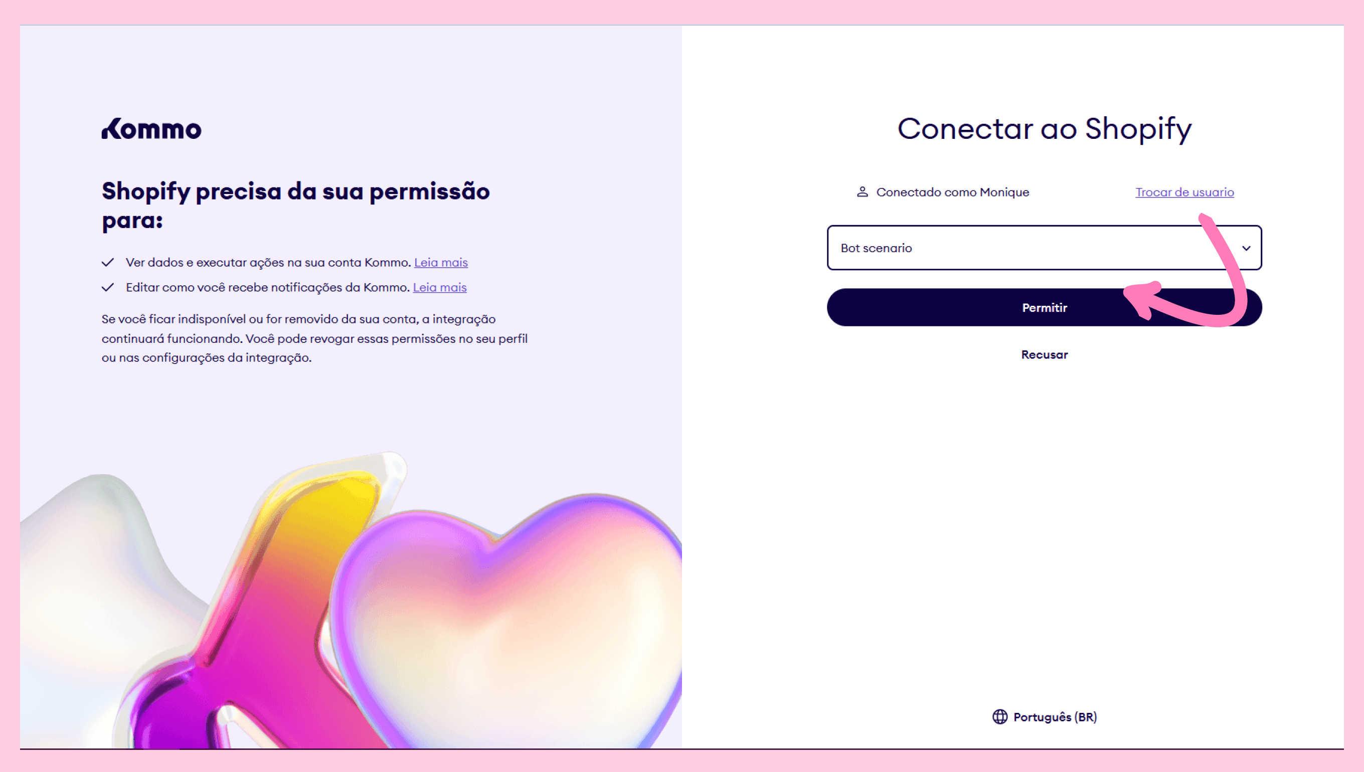 Faça login na sua conta Kommo e conceda as permissões necessárias.