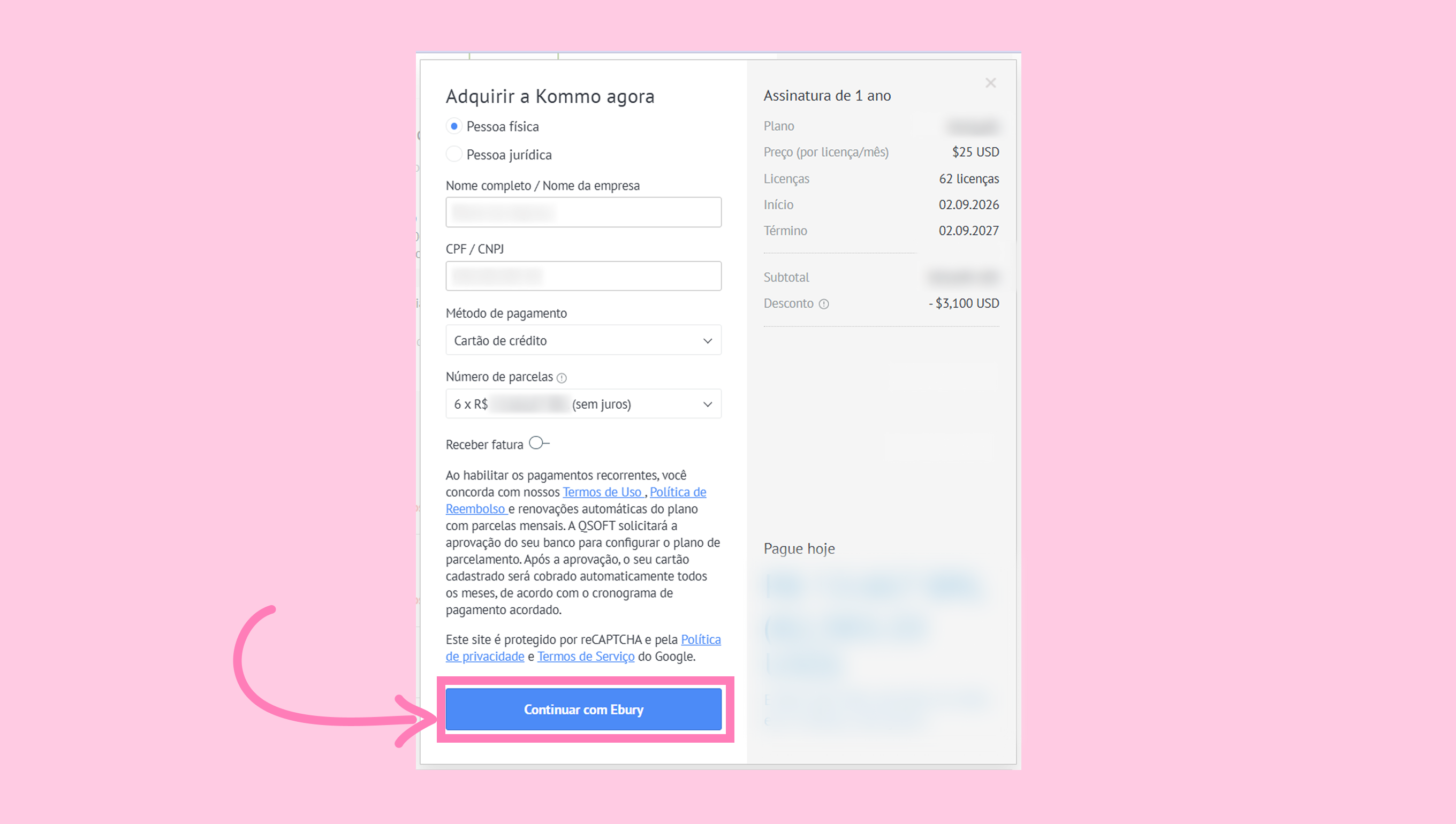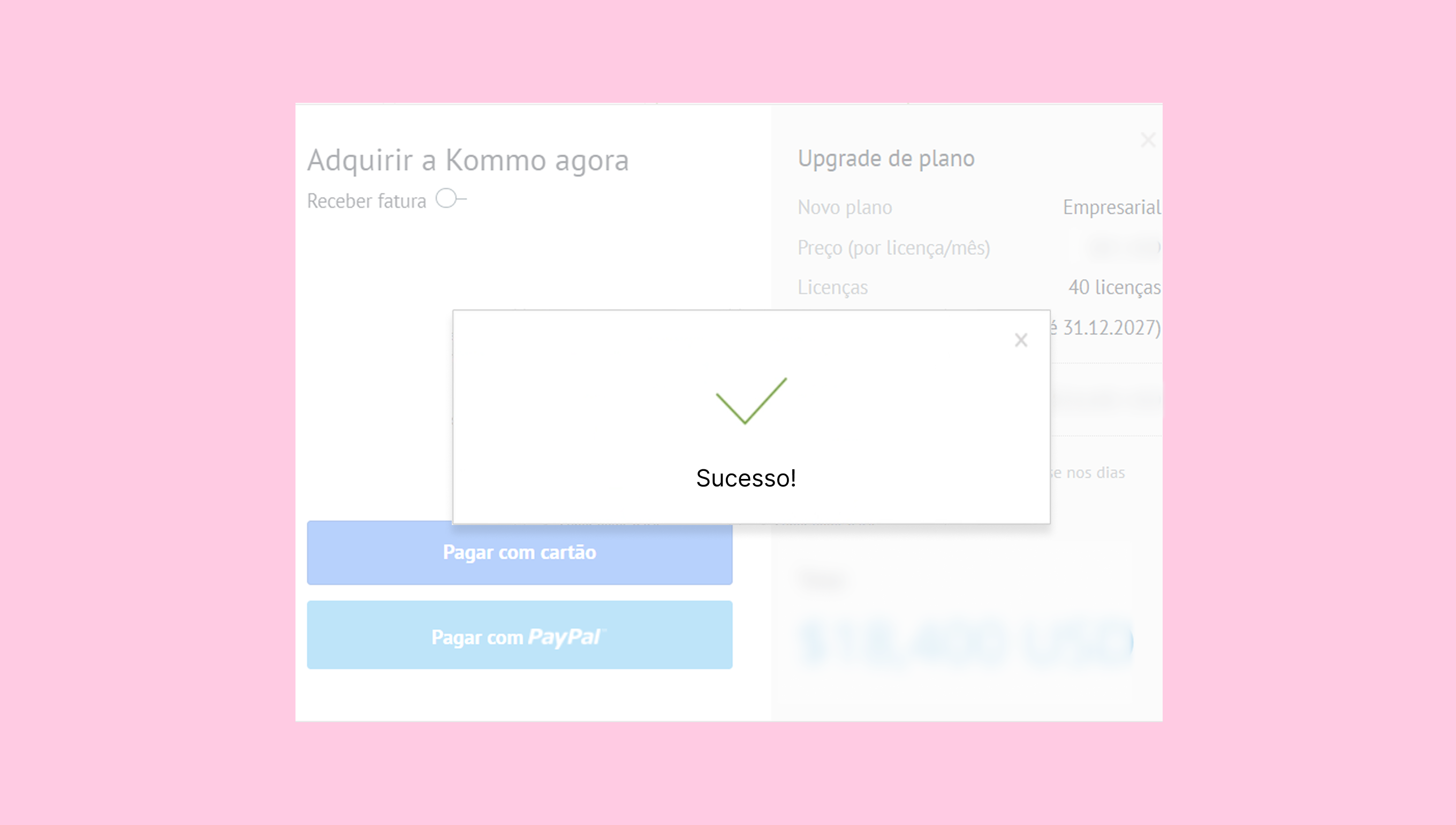 - Uma janela modal será aberta com o resumo do pedido. O próximo passo depende se os pagamentos recorrentes estão ativados em sua conta.