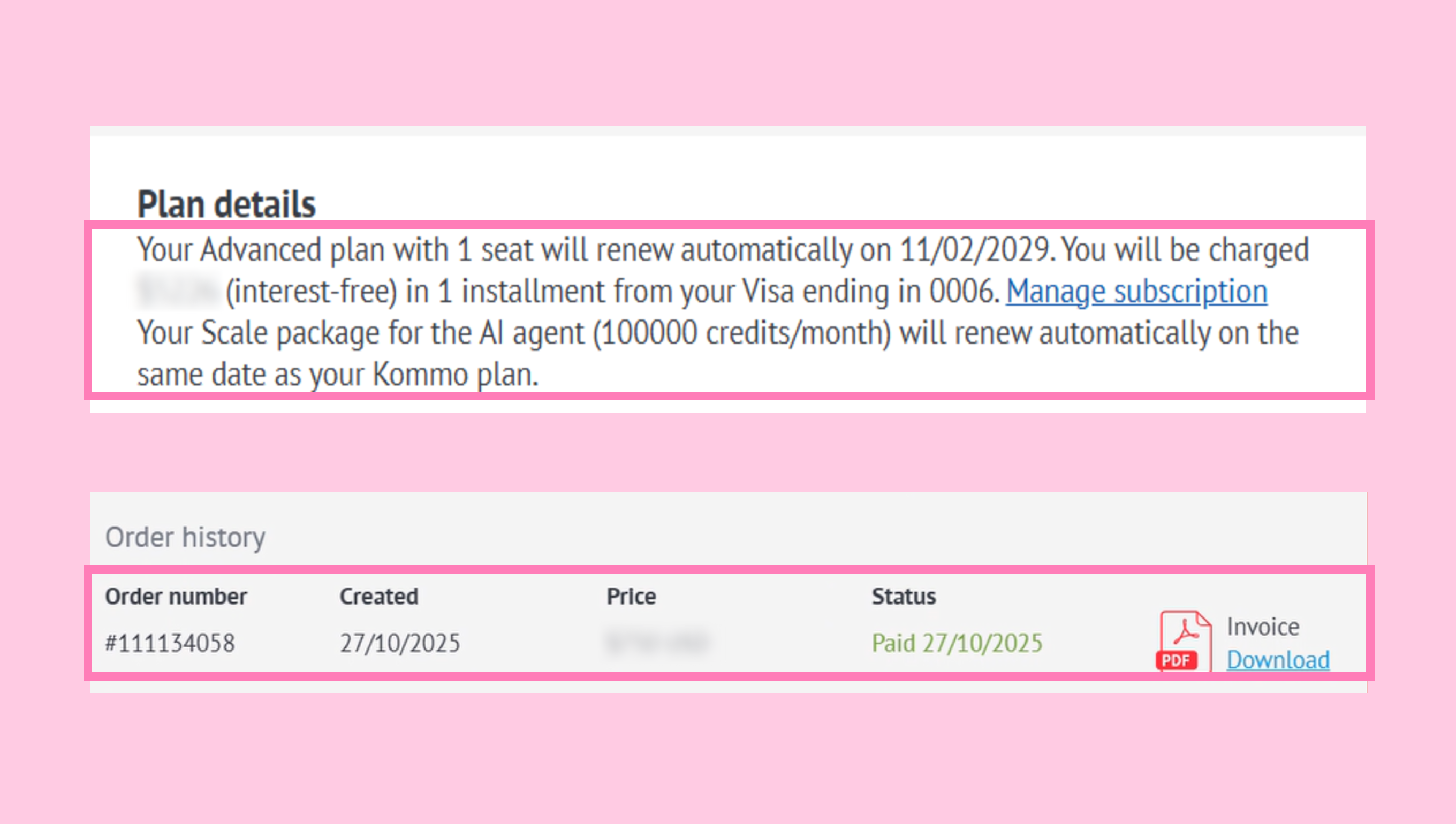 Na seção de Faturamento, você pode verificar os Detalhes do plano e o Histórico de pedidos para confirmar o status do pagamento.
