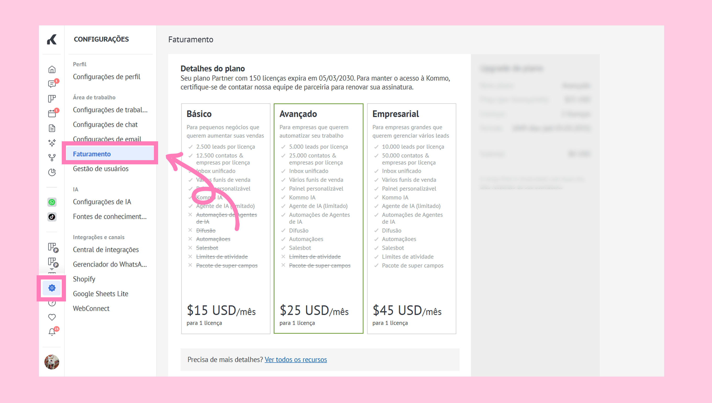 Observação: Se você estiver no plano Shopify, não verá a seção Faturamento na Kommo.