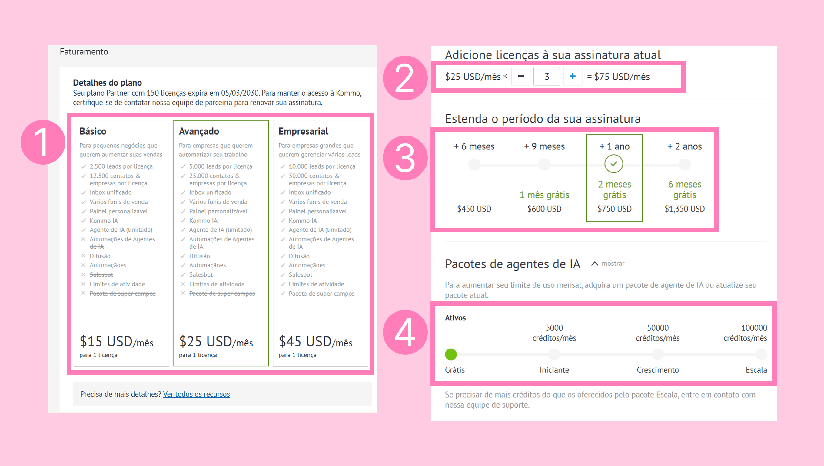 Ao adquirir um pacote de agente de IA, aplicam-se as seguintes opções de pagamento e regras de renovação: