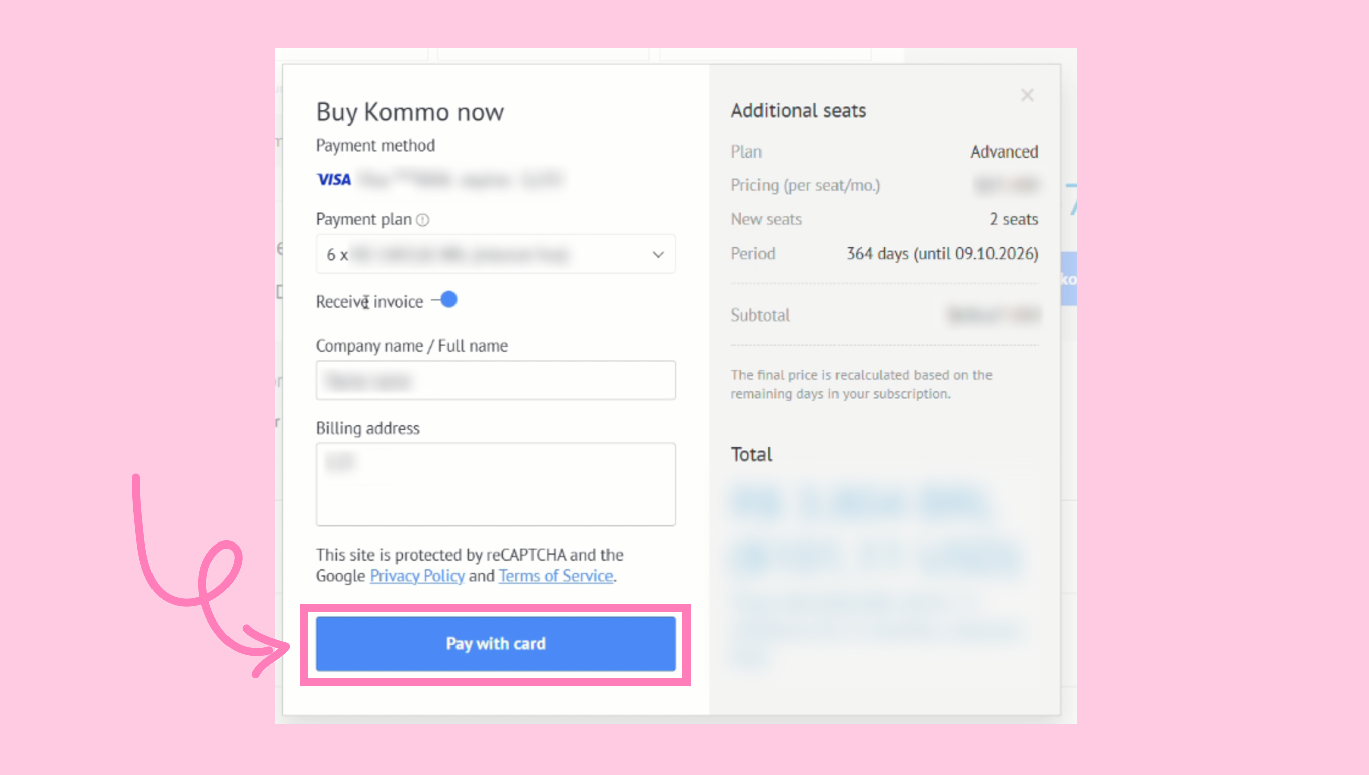 b. Se os pagamentos recorrentes estiverem ativados, preencha os campos obrigatórios e clique em Pagar com cartão para concluir o pagamento.