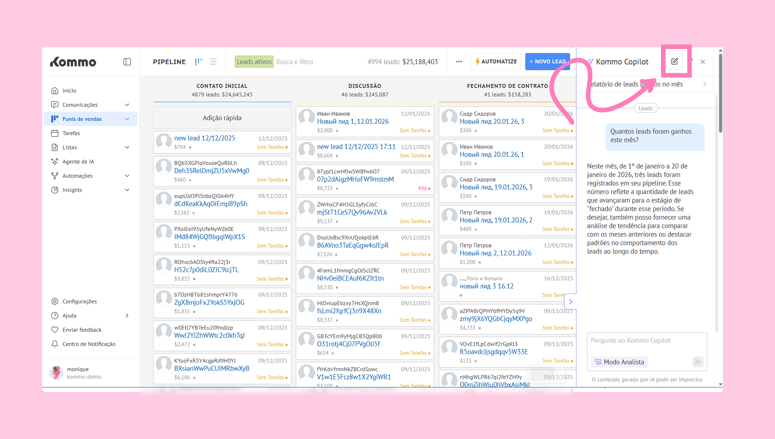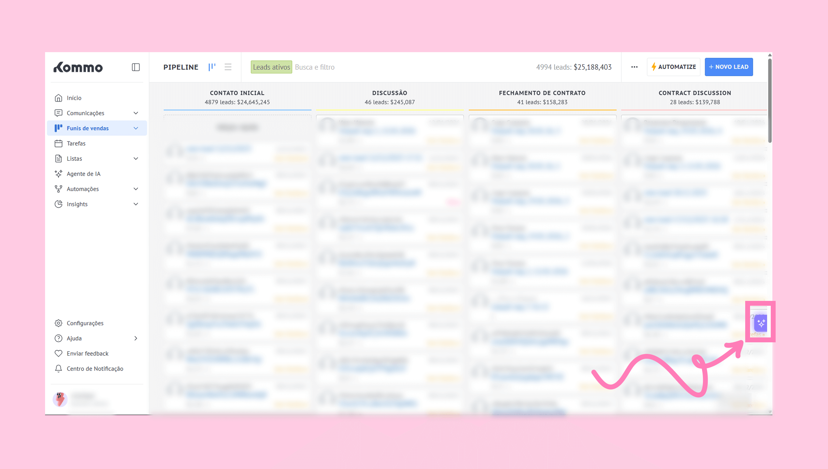 Abra o Copilot na Kommo clicando no ícone de brilho no lado direito da tela.