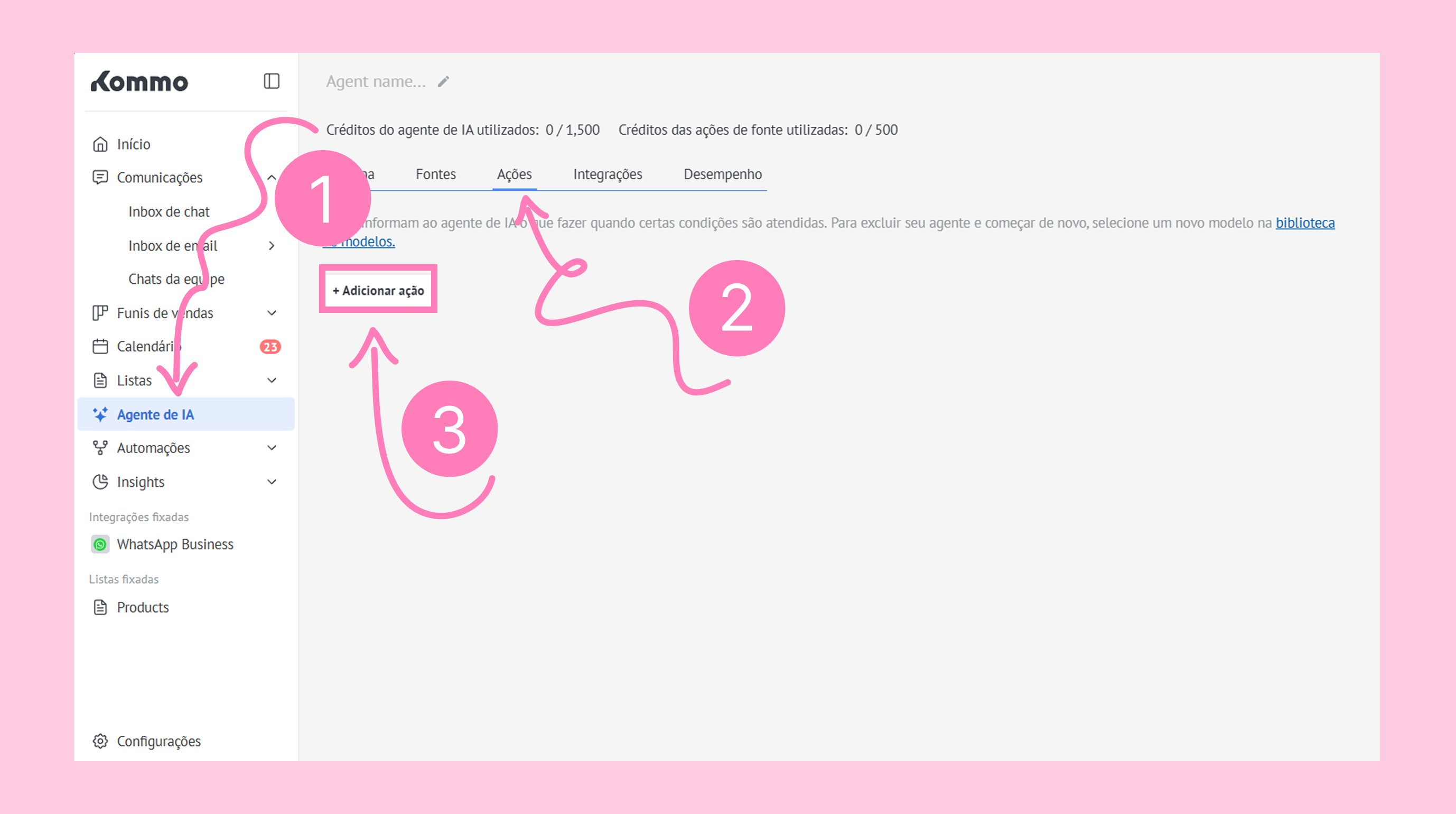 Vá para Agente de IA e abra a aba Ações. Clique em + Adicionar ação.