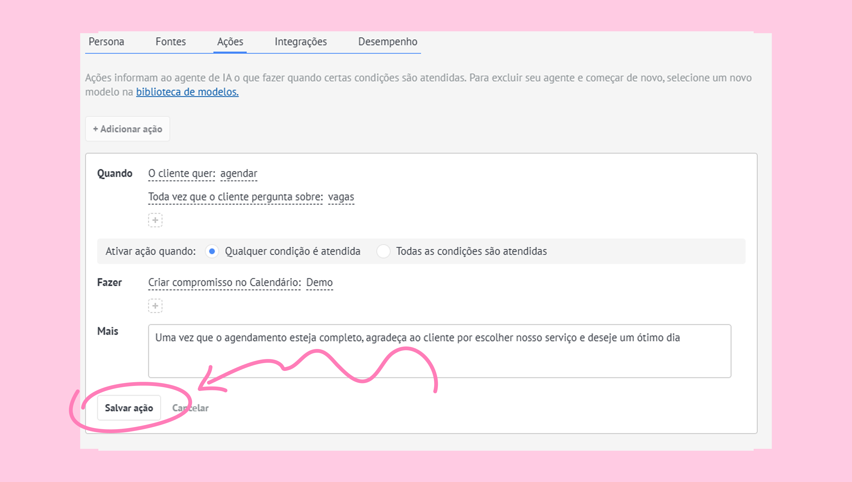 Selecione quando você quer que a ação seja disparada no campo Ativar ação quando.