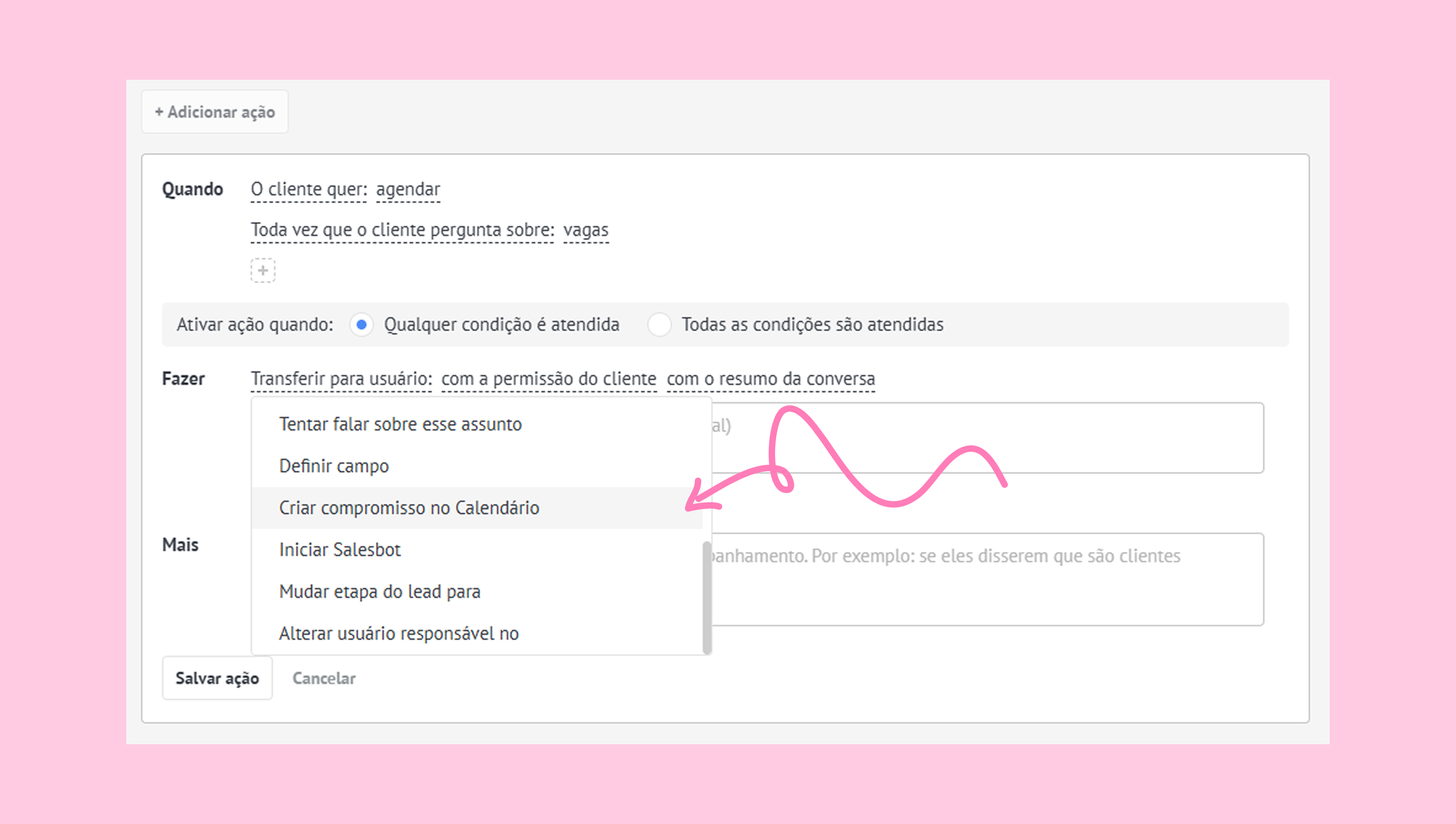 Configure a opção FAZER clicando em Transferir para usuário e selecionando Criar compromisso no Calendário.