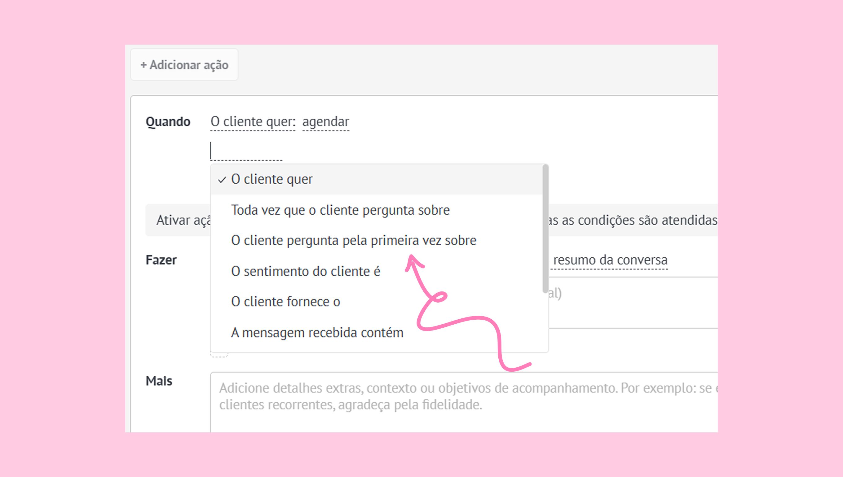 Configure a condição MAIS (opcional) clicando no campo Mais e escrevendo uma breve descrição.