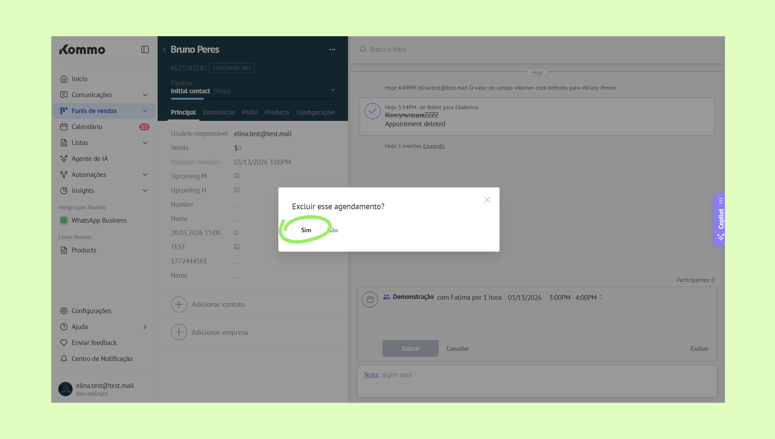 Você verá uma mensagem de sucesso confirmando a ação. O compromisso cancelado será removido do cartão do lead e do calendário.