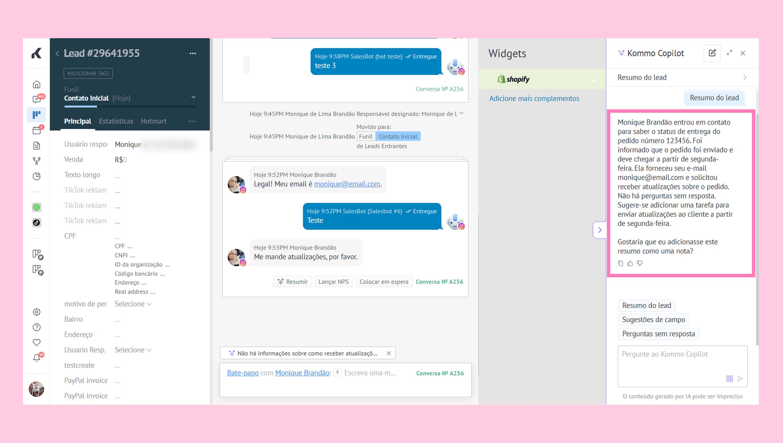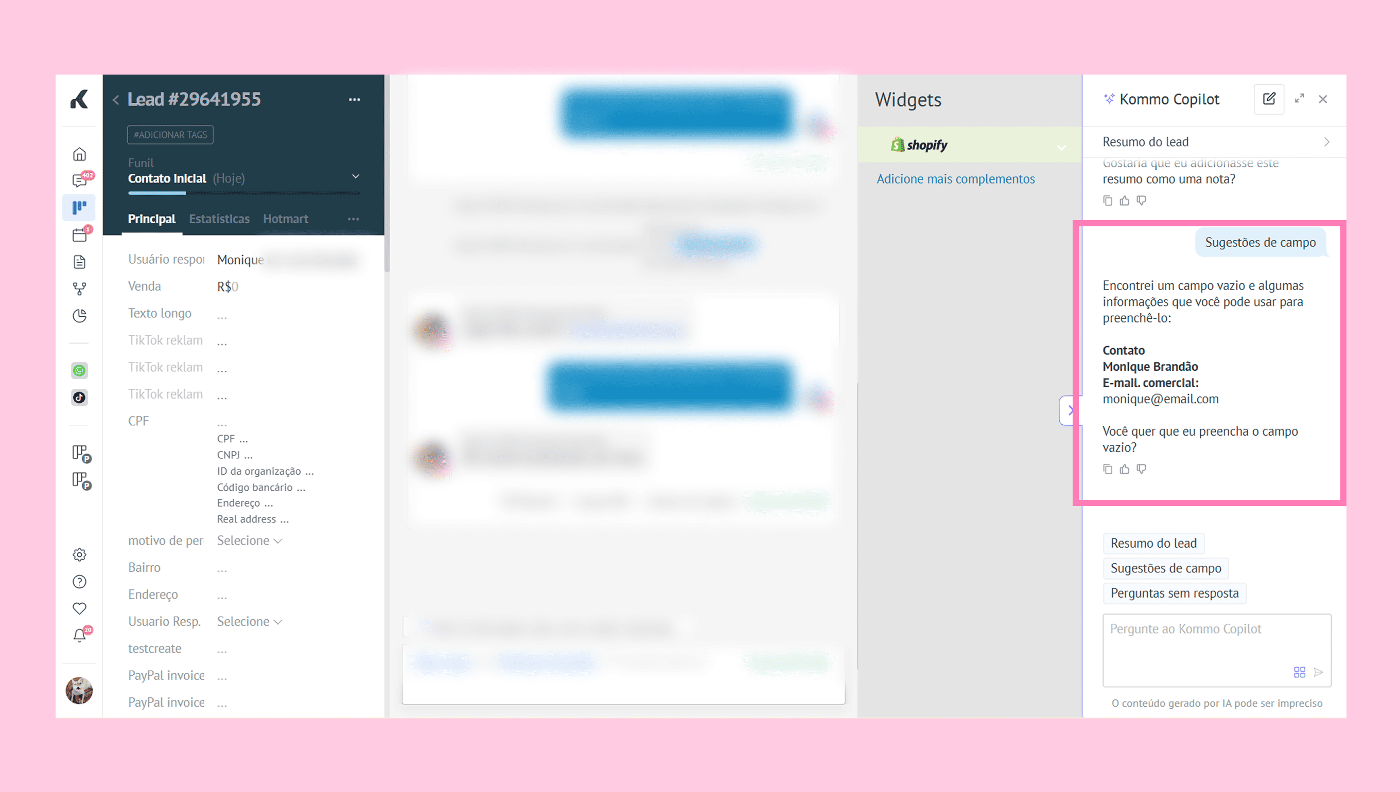 Se um cliente mencionar o email no chat, mas ele não estiver no cartão, o Copilot sugerirá adicioná-lo. Após a confirmação, o campo será preenchido automaticamente.