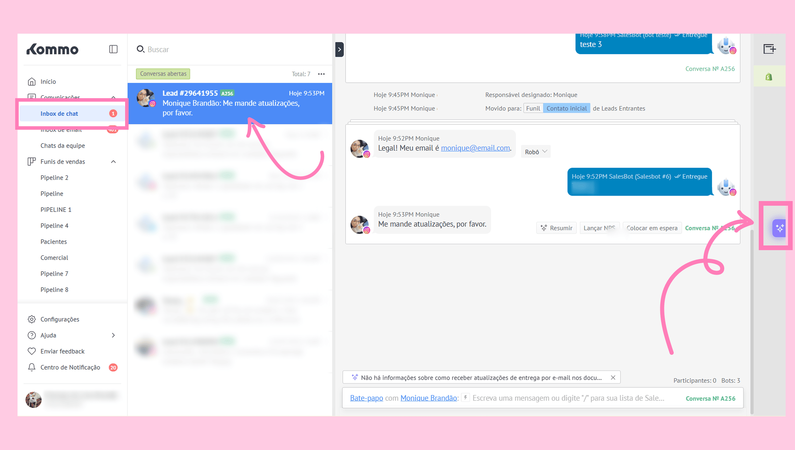 Para usar o Recurso de enriquecimento de dados, vá para a seção de Pipelines e abra qualquer lead em qualquer pipeline, ou acesse a seção de Comunicações, abra o Inbox de chat, e selecione o cartão de lead com o qual deseja trabalhar. Em seguida, clique no ícone do Copilot no lado direito da tela.