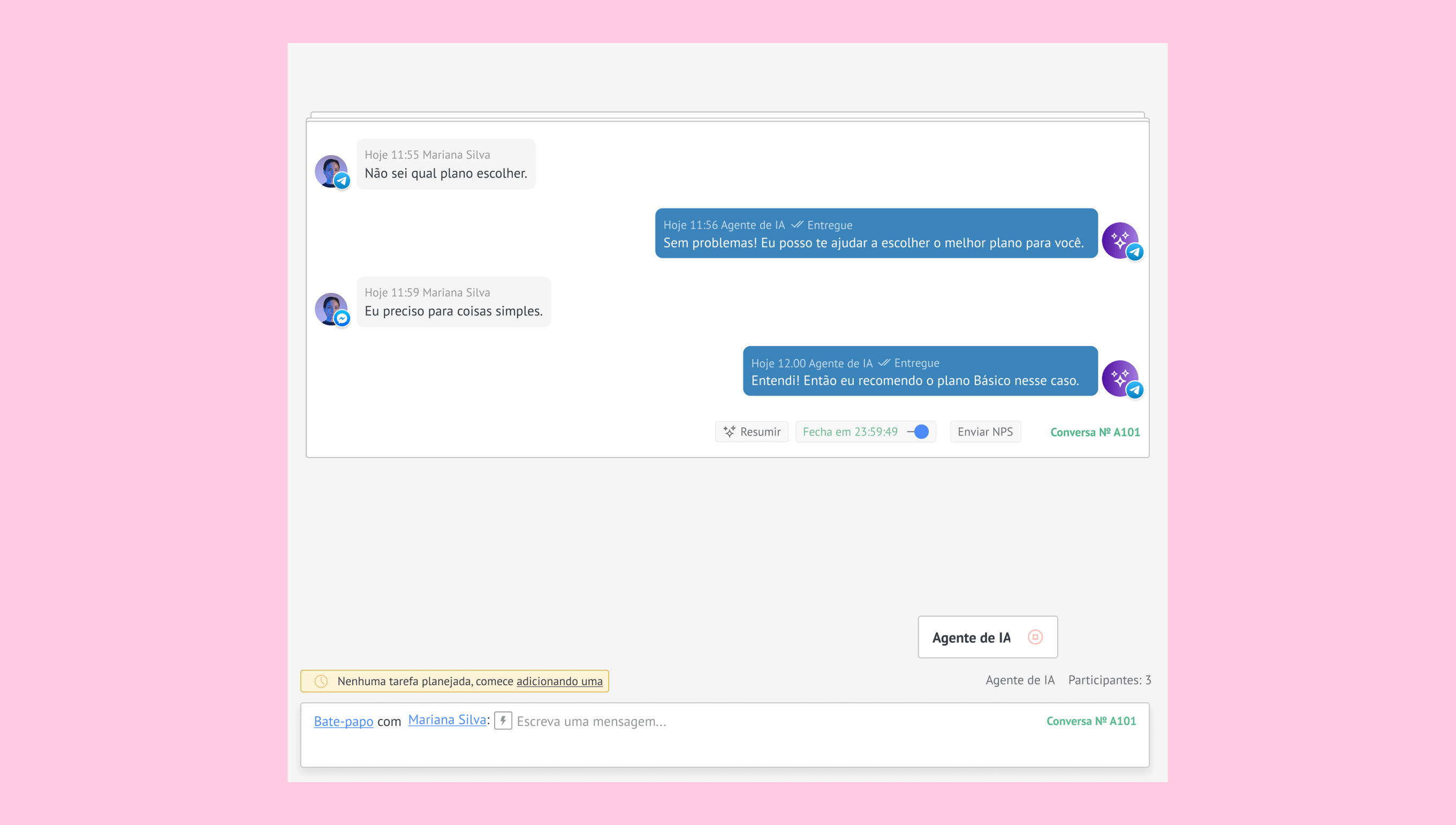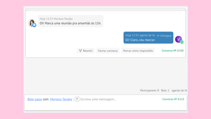 Aqui você pode ver o número de leads únicos atendidos pelo agente, conversas respondidas e não respondidas, transferências para colegas de equipe e o tempo médio de resposta.
