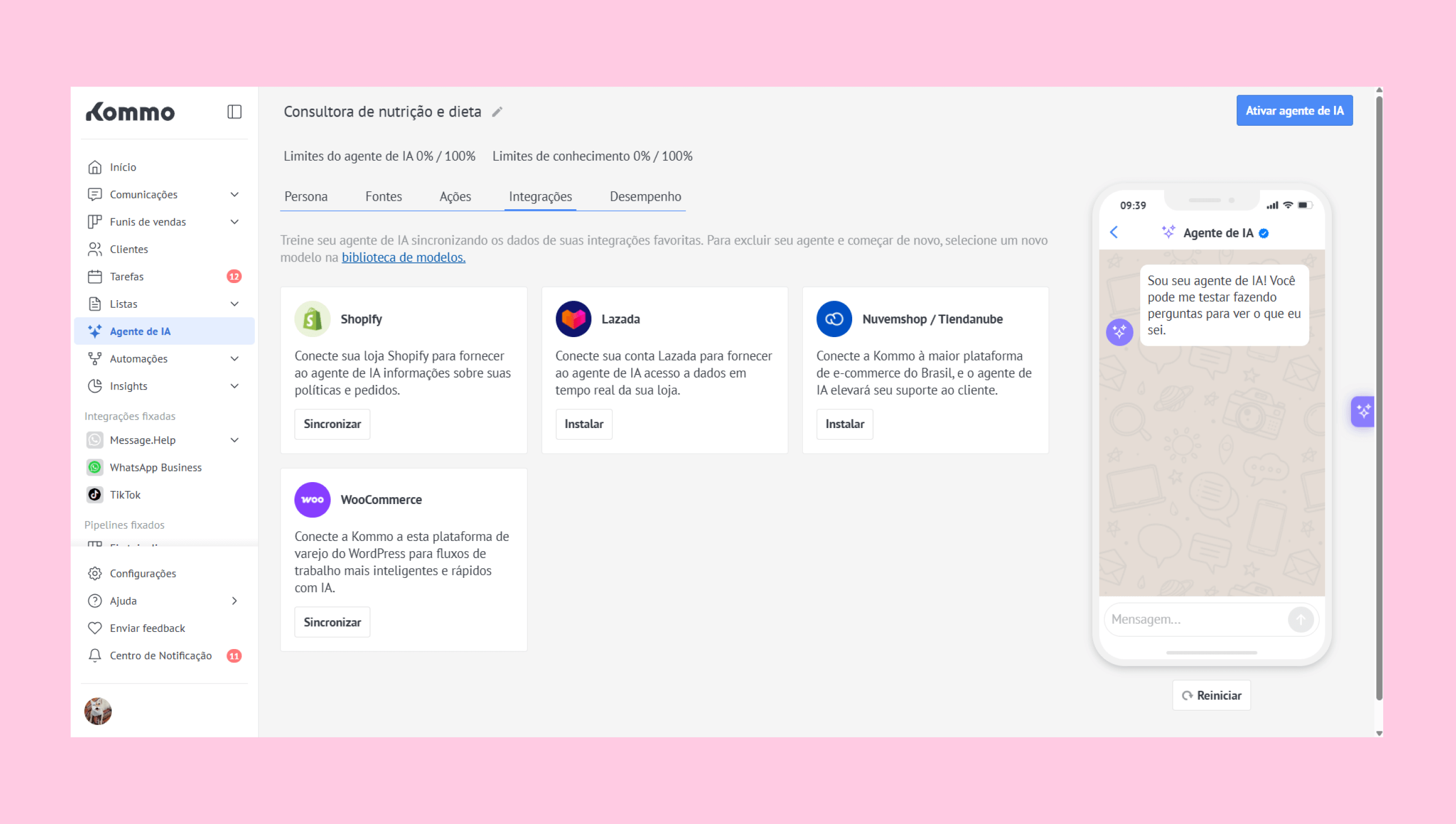 As integrações conectam sua loja online ao agente de IA para que ele possa usar dados em tempo real nas conversas. Esse recurso foi desenvolvido para empresas de e-commerce que desejam que o agente acesse detalhes do produto, níveis de estoque e políticas da loja diretamente da plataforma.