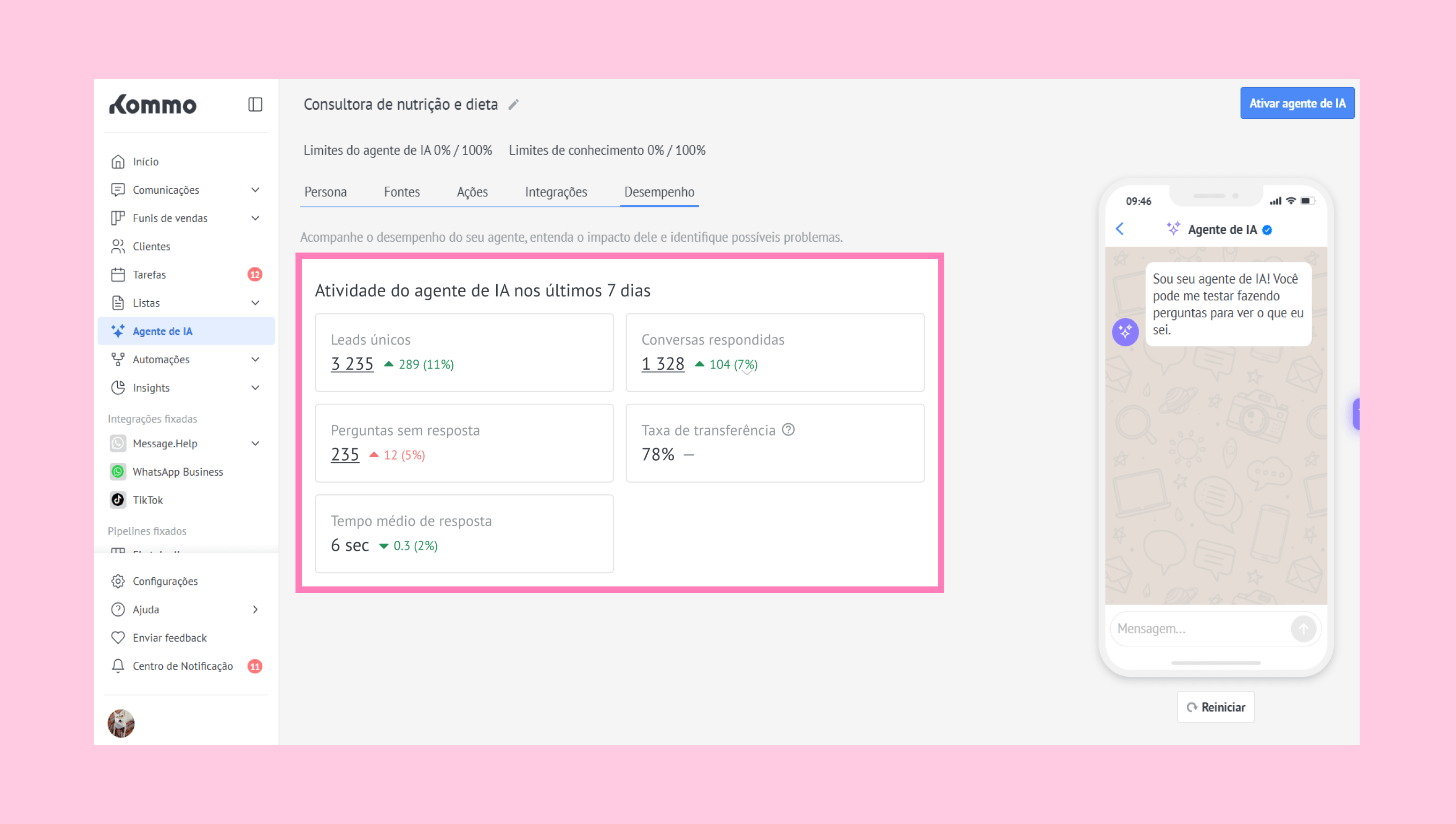 O agente de IA da Kommo é um assistente de IA integrado à Kommo que pode lidar automaticamente com conversas com clientes e tarefas de suporte em diversos canais, 24 horas por dia, 7 dias por semana, usando seus próprios dados e regras de negócios — com um tempo médio de primeira resposta de 3 a 8 segundos.