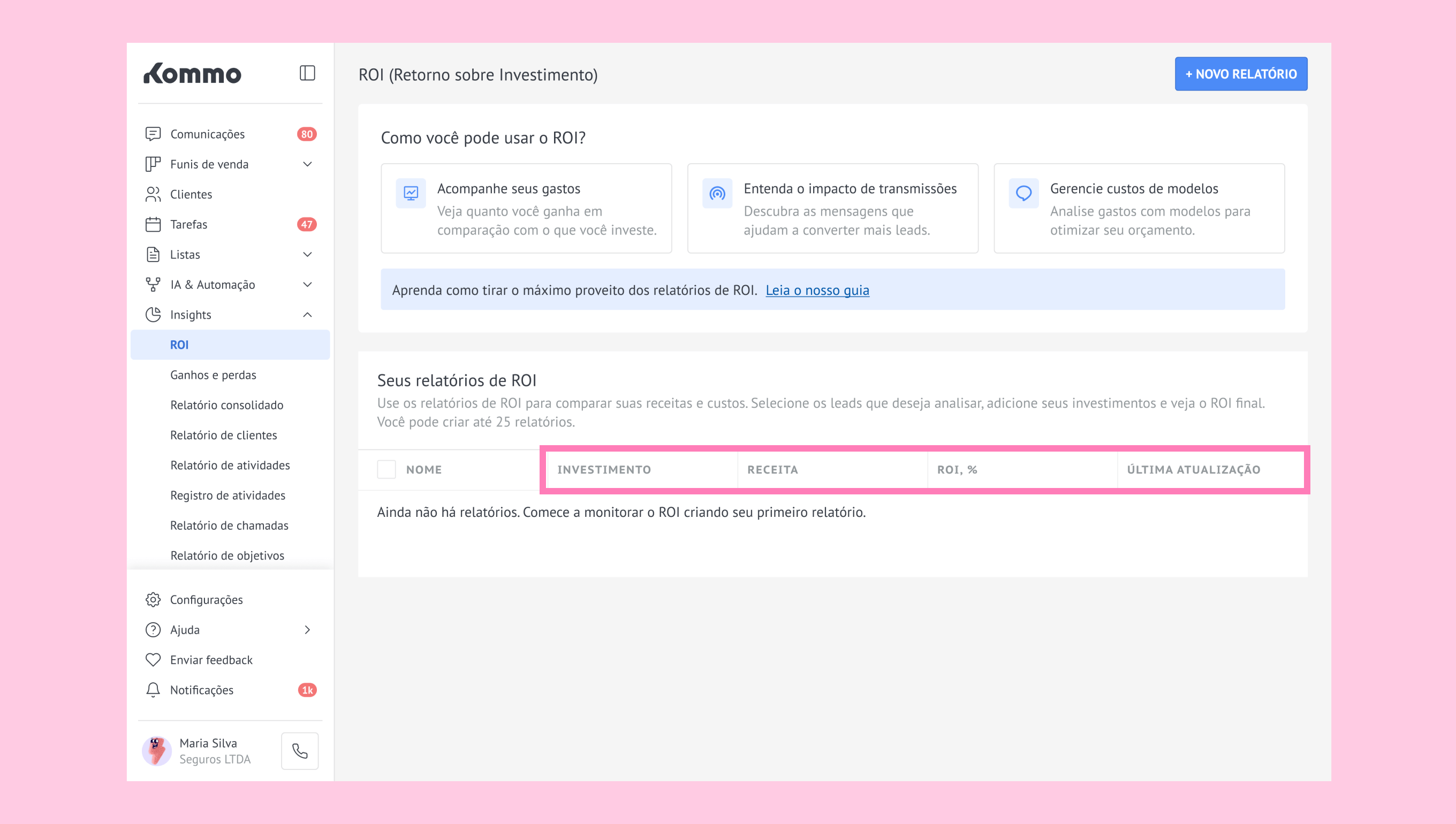 Os relatórios de ROI focam em dois valores: seu Investimento e sua Receita. A Kommo usa esses números para calcular seu ROI, ajudando você a entender quanto gasta, quanto ganha e quão eficientes são suas ações.