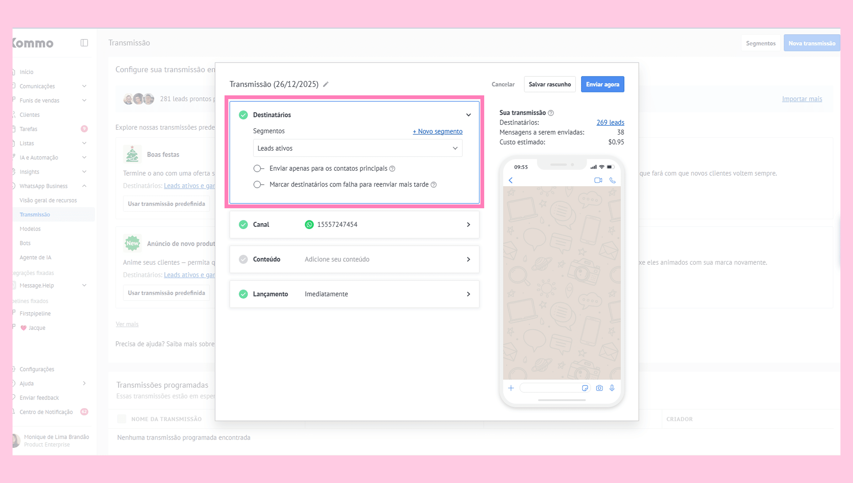 Observação: certifique-se de que o canal selecionado esteja disponível para os destinatários escolhidos. Se um lead não puder ser contatado por esse canal, a transmissão não será entregue a ele.