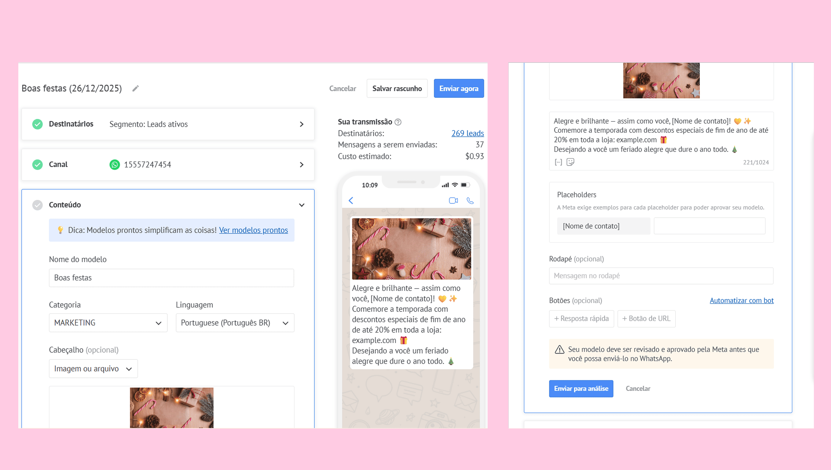 Clicar nele enviará a transmissão assim que a Meta aprovar o modelo – geralmente em até 30 minutos. Se você agendar, o horário mais cedo possível deve ser com pelo menos 30 minutos de antecedência. Se a aprovação não for recebida a tempo, a transmissão será movida para Rascunhos.
