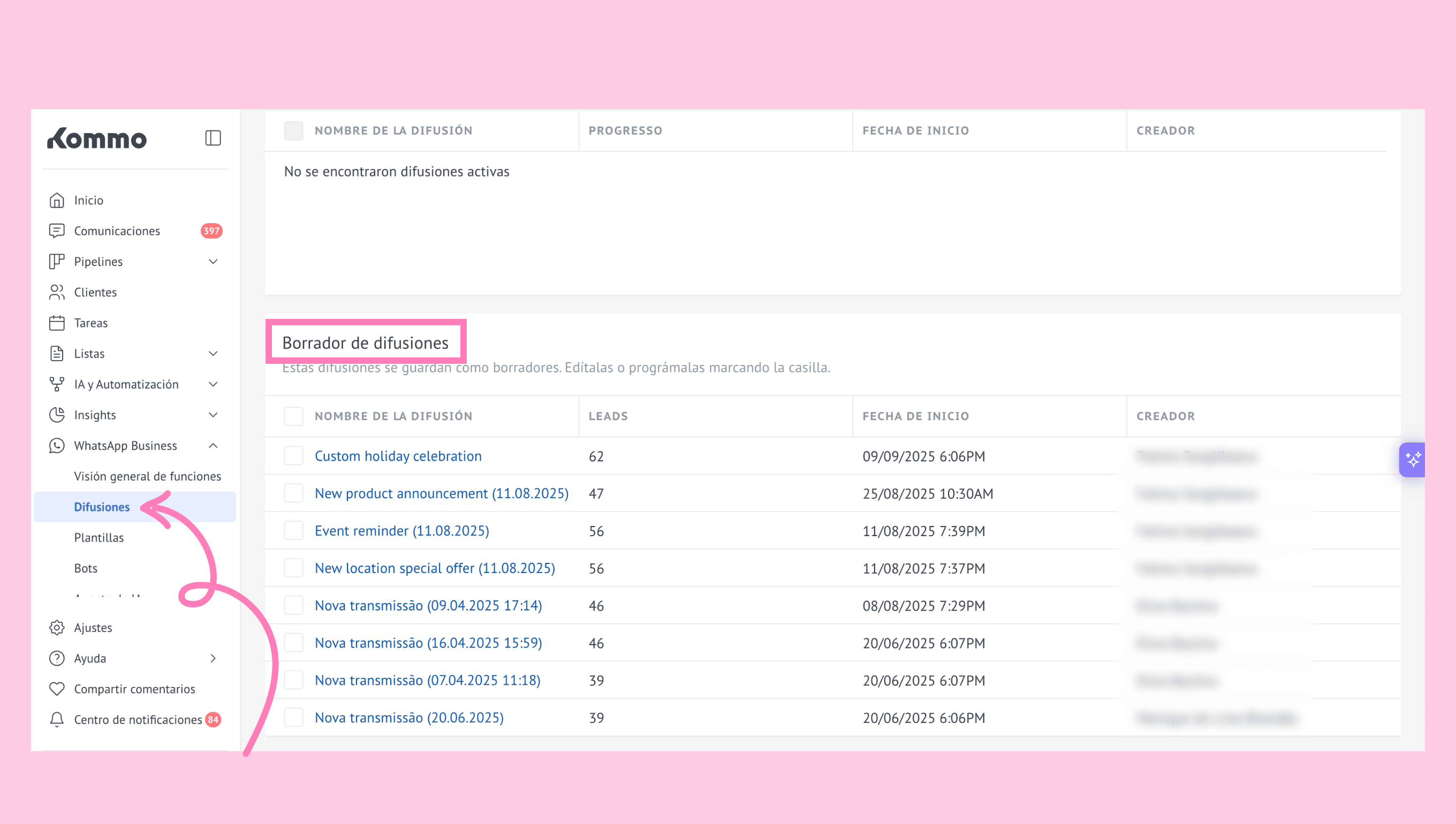 Observação: para evitar o envio de mensagens duplicadas, a Kommo remove automaticamente os contatos repetidos durante uma transmissão. Por exemplo, se vários leads compartilham o mesmo número de telefone, a mensagem será enviada apenas uma vez para esse número.