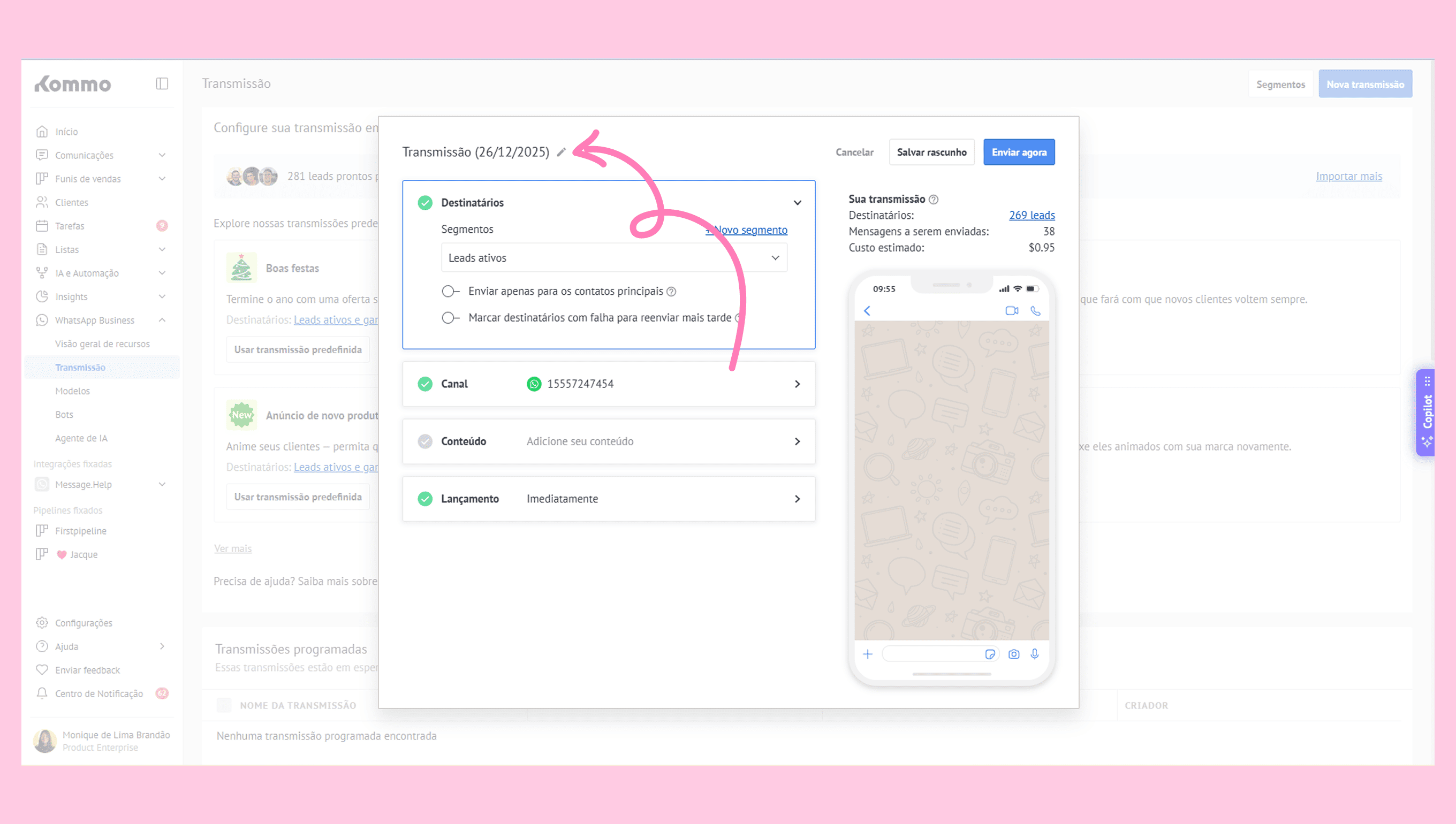 Use modelos do WhatsApp ou da Kommo ou crie sua própria mensagem. Neste caso, não é necessária pré-aprovação para modelos.