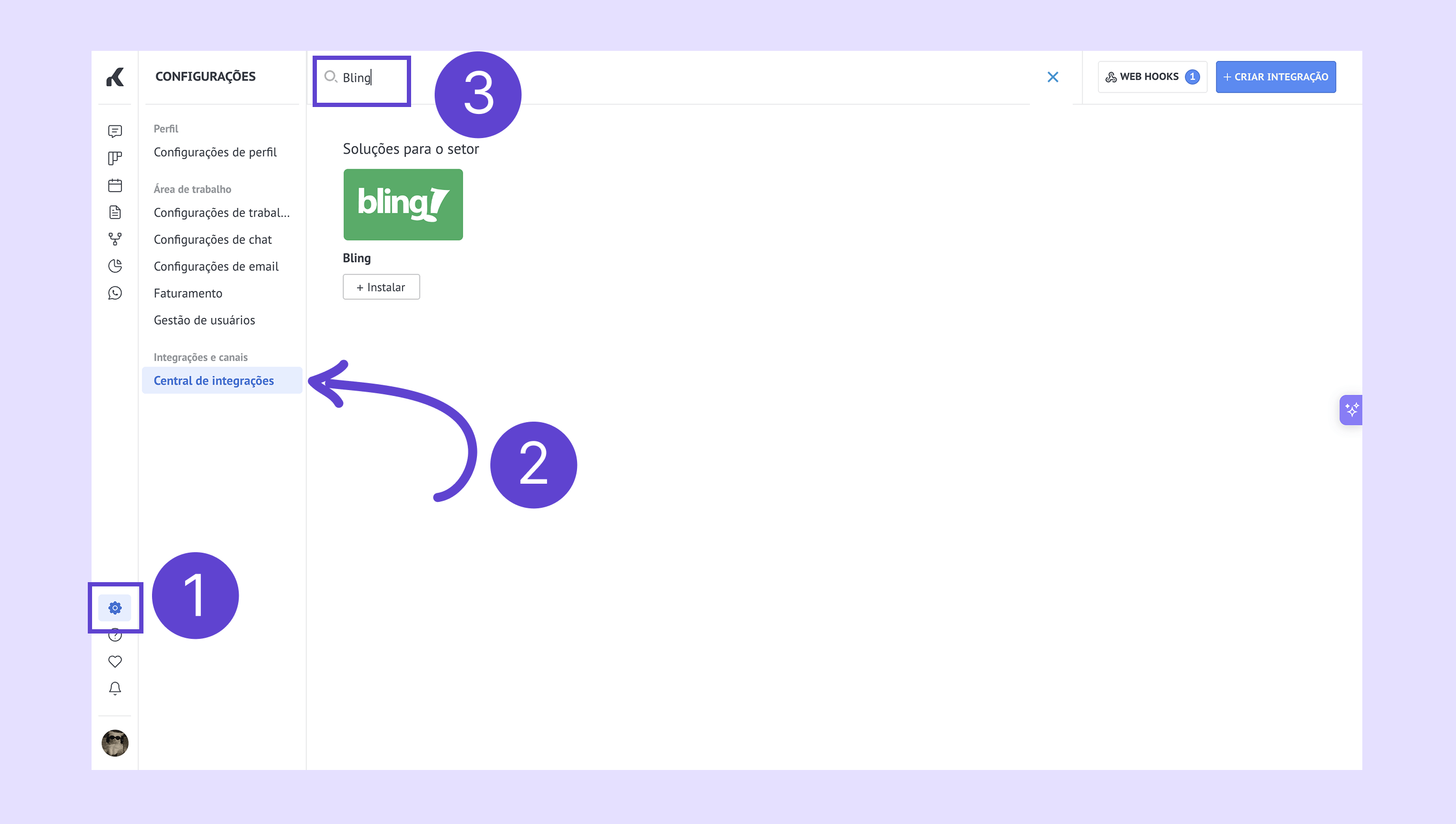 Na aba Configurações, você verá os passos que precisa seguir para instalar o Bling: