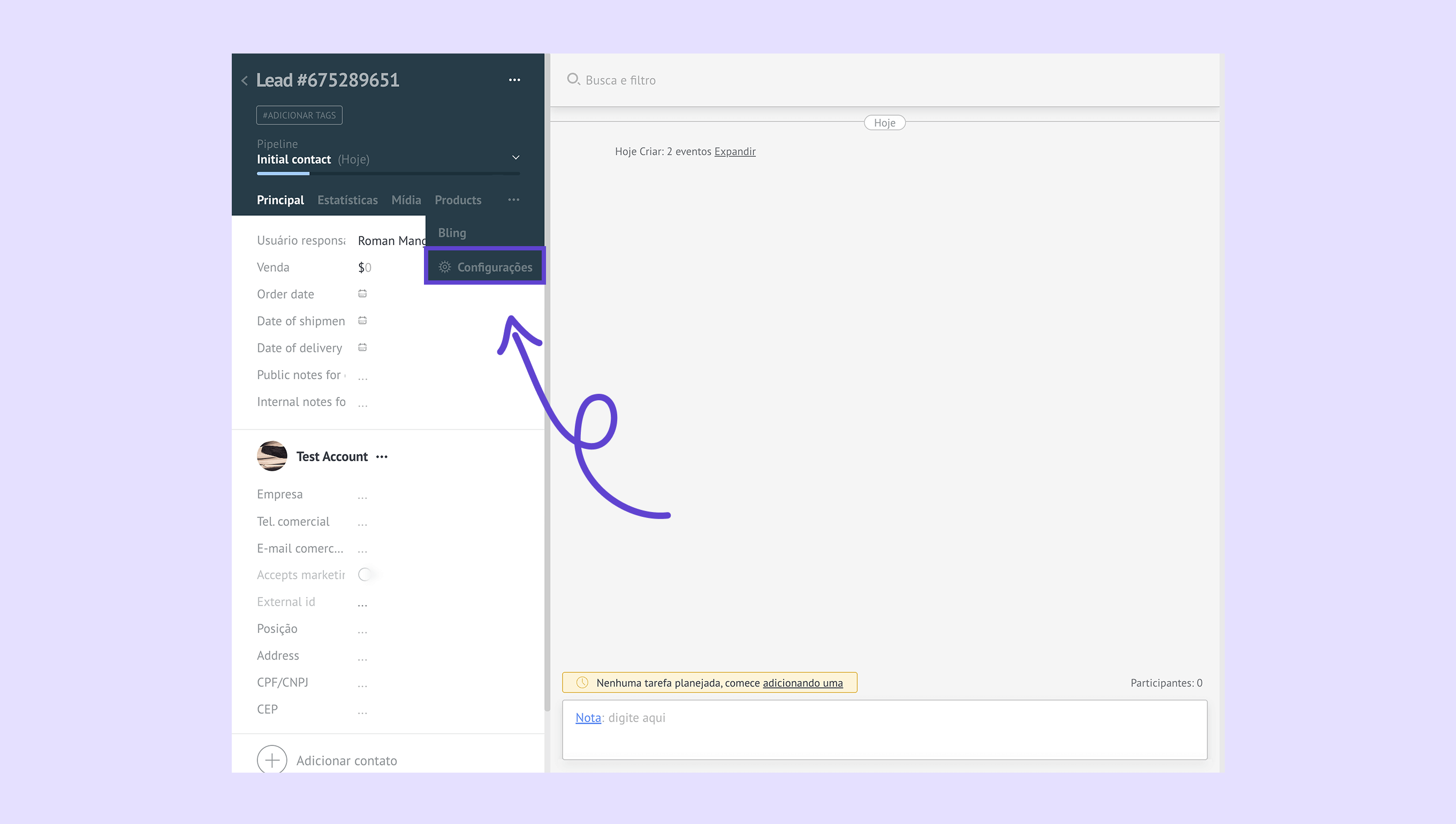 Após a conexão, você precisará combinar seus campos e adicionar itens Bling aos seus cartões de leads.