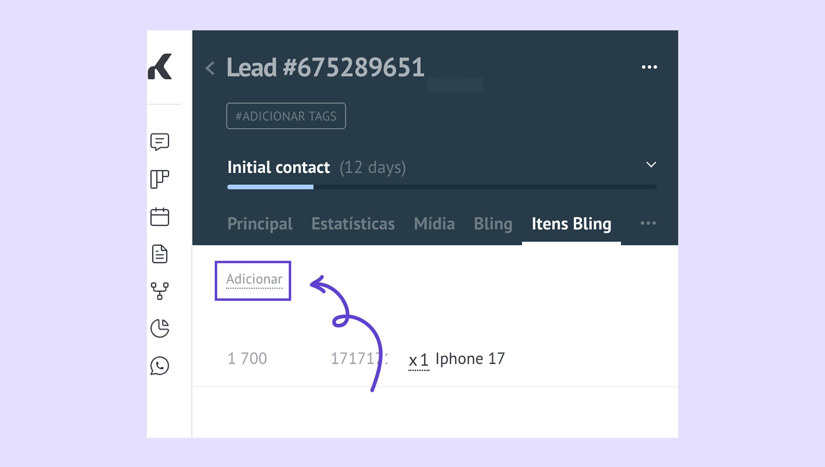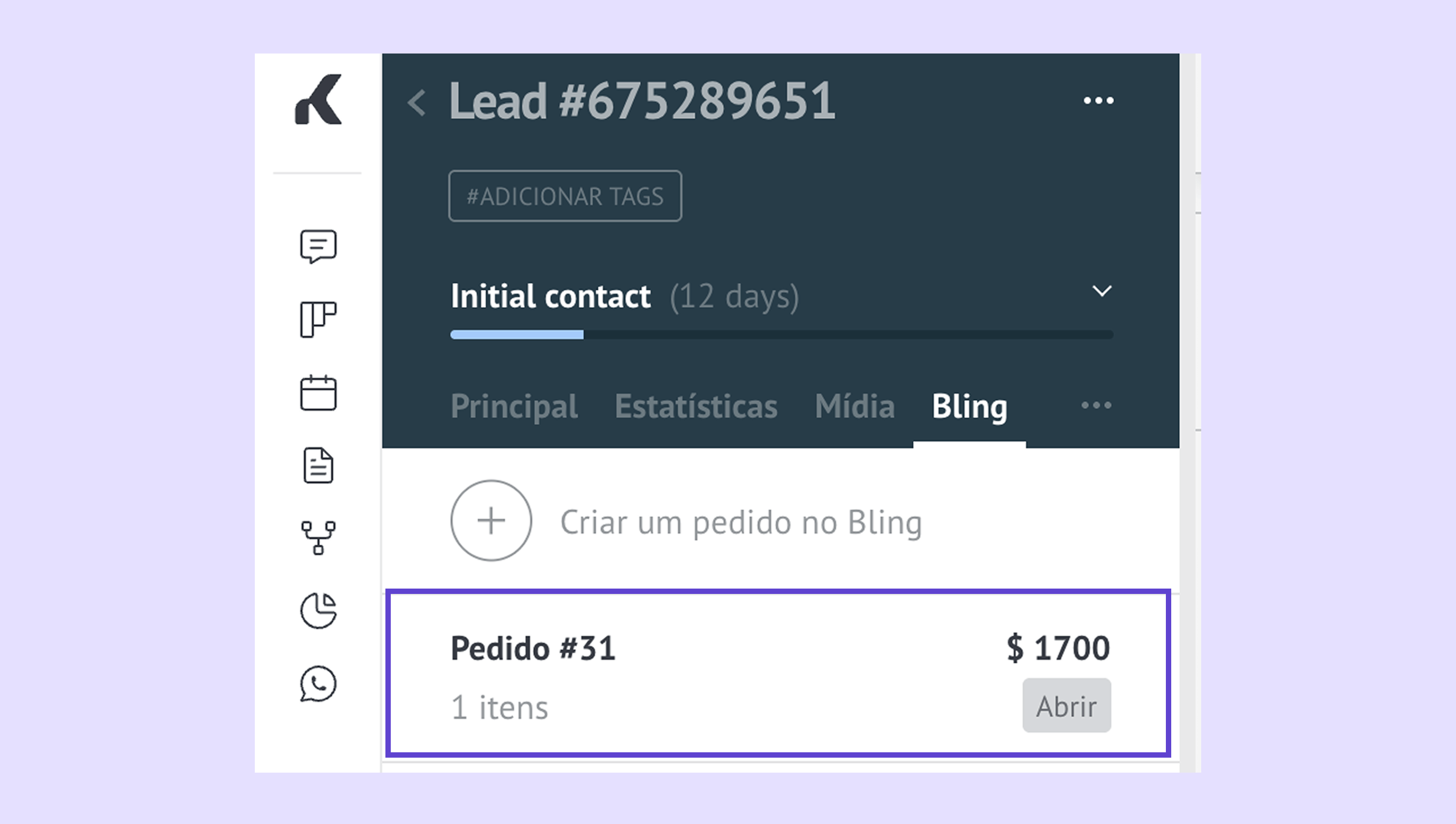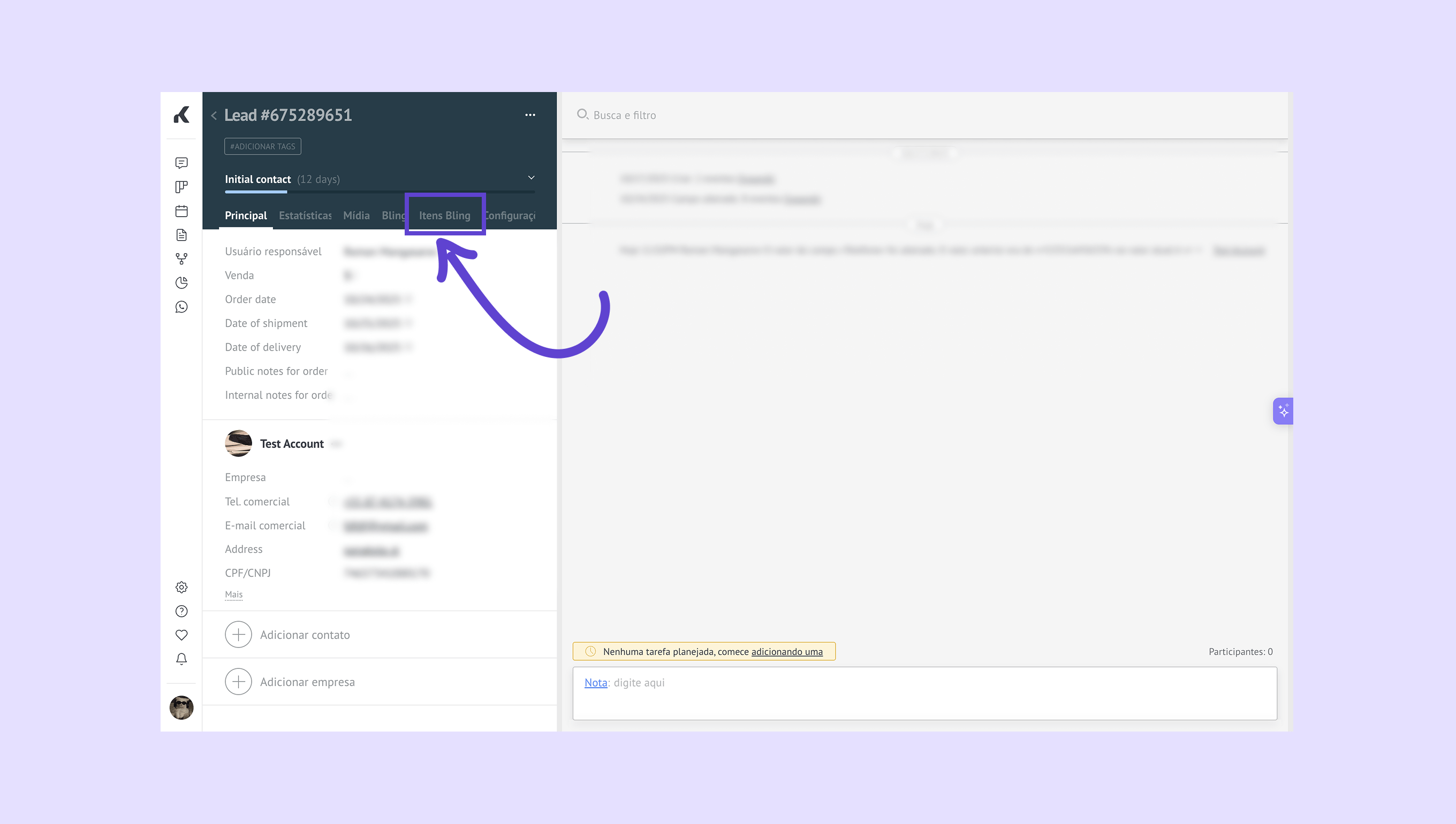 Adicione uma aba de itens Bling ao seu cartão de leads para visualizar e gerenciar produtos diretamente na Kommo.