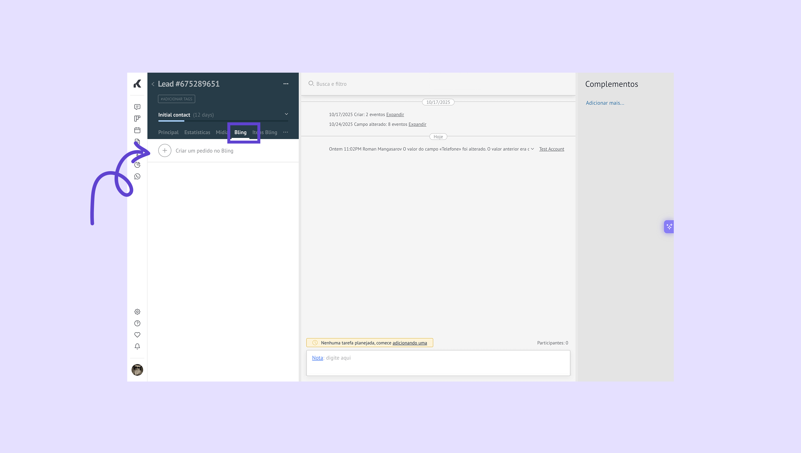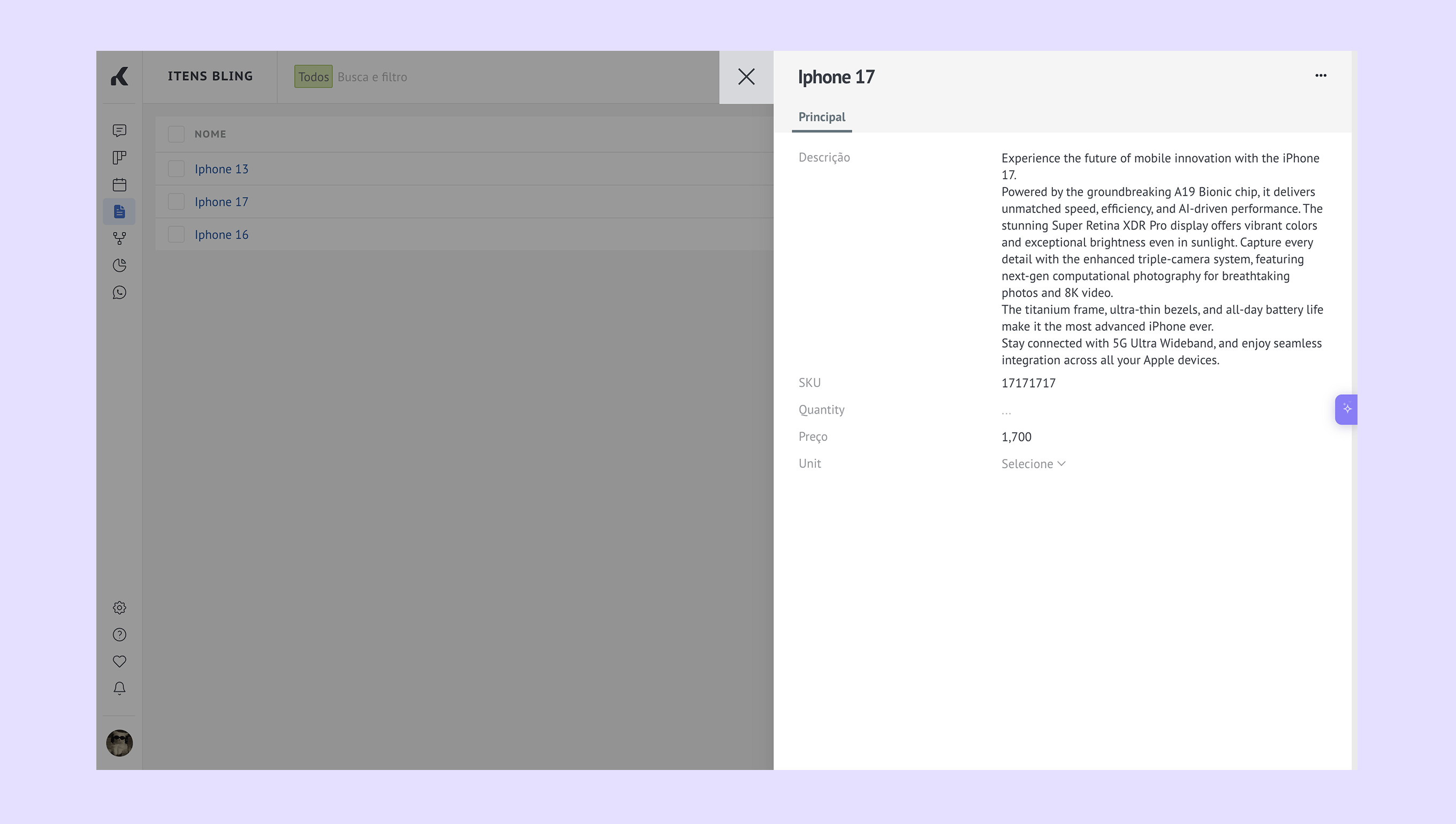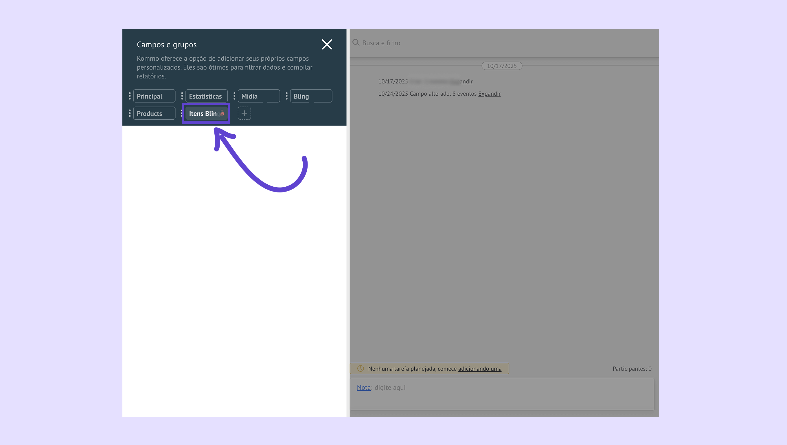 Adicione uma aba de itens Bling ao seu cartão de leads para visualizar e gerenciar produtos diretamente na Kommo.