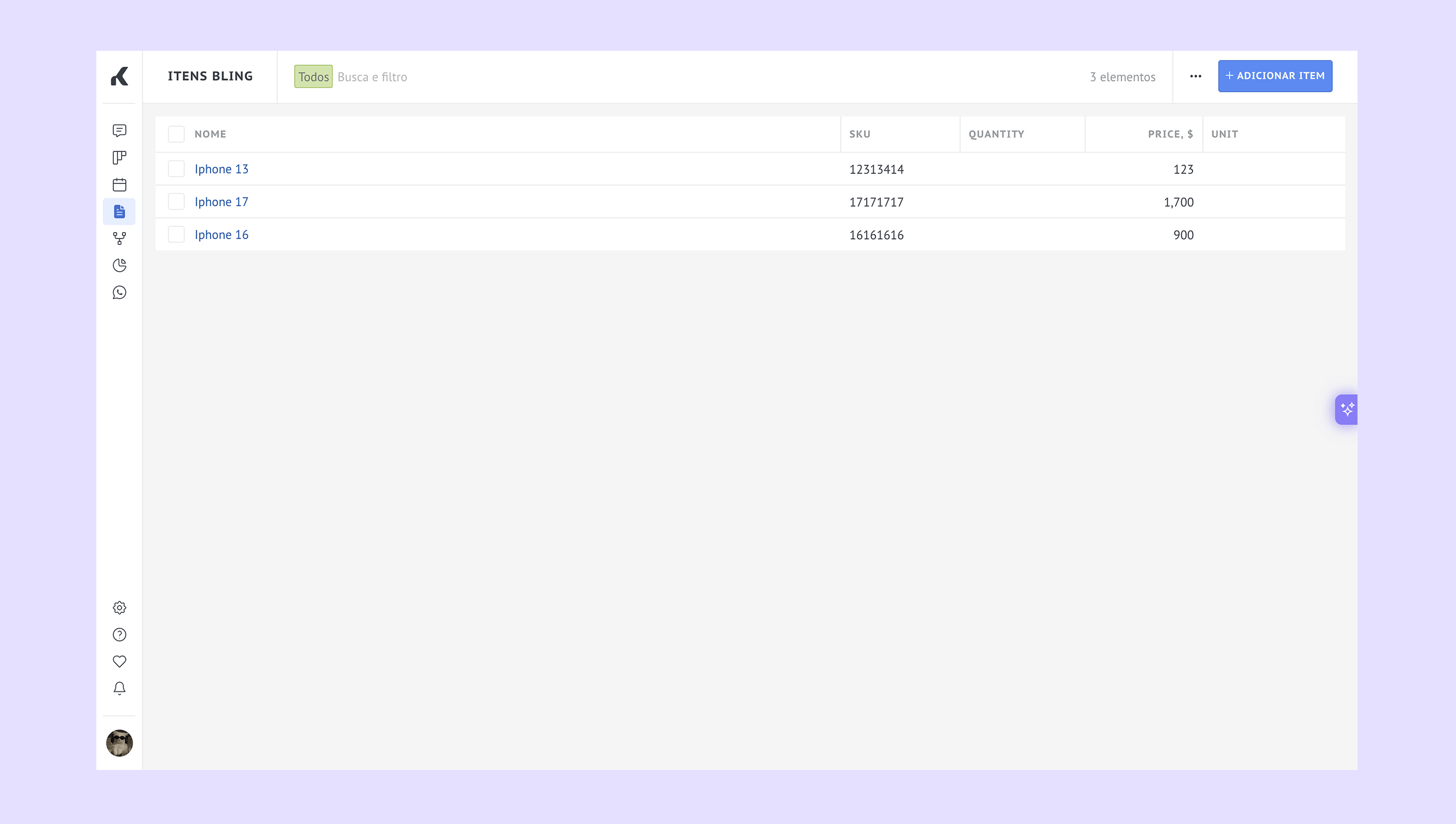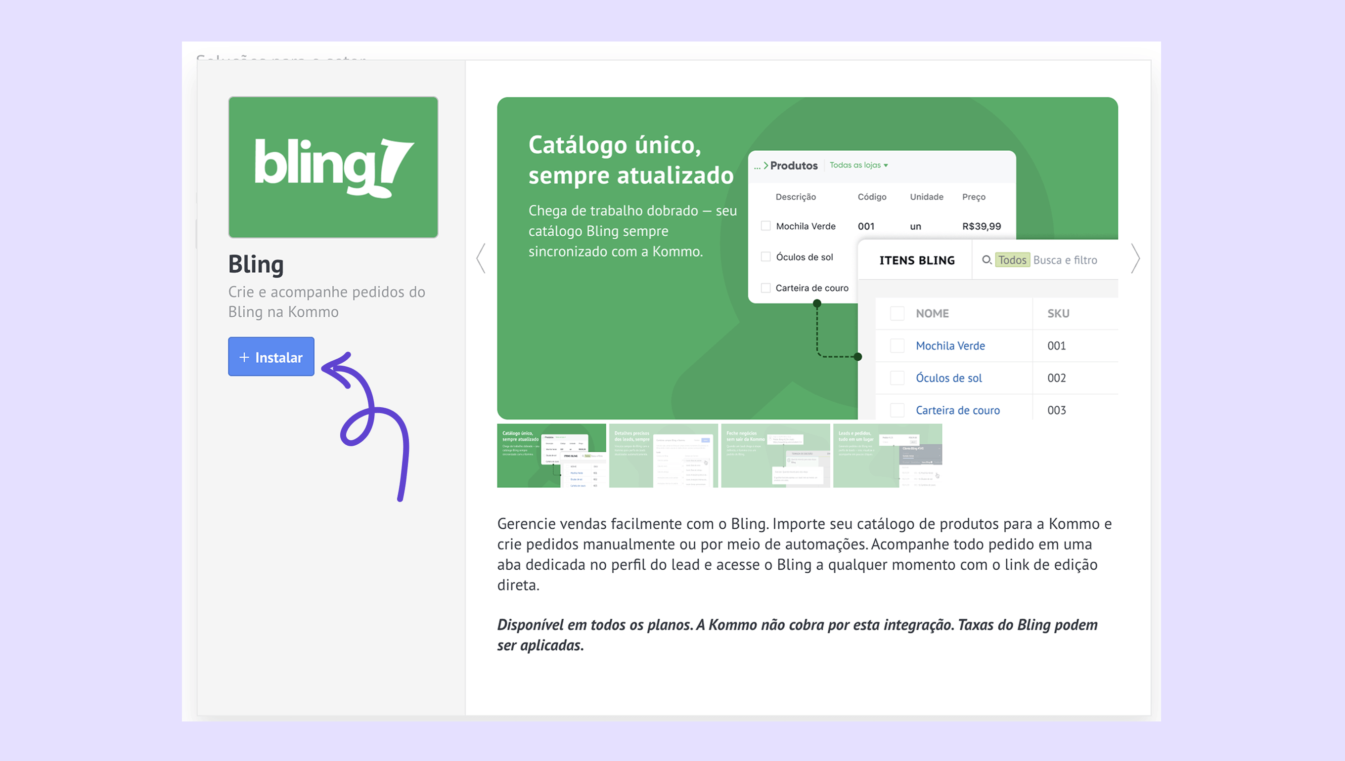 Agora a sua aba de itens Bling está pronta — você pode visualizar, adicionar e gerenciar produtos Bling diretamente na Kommo.
