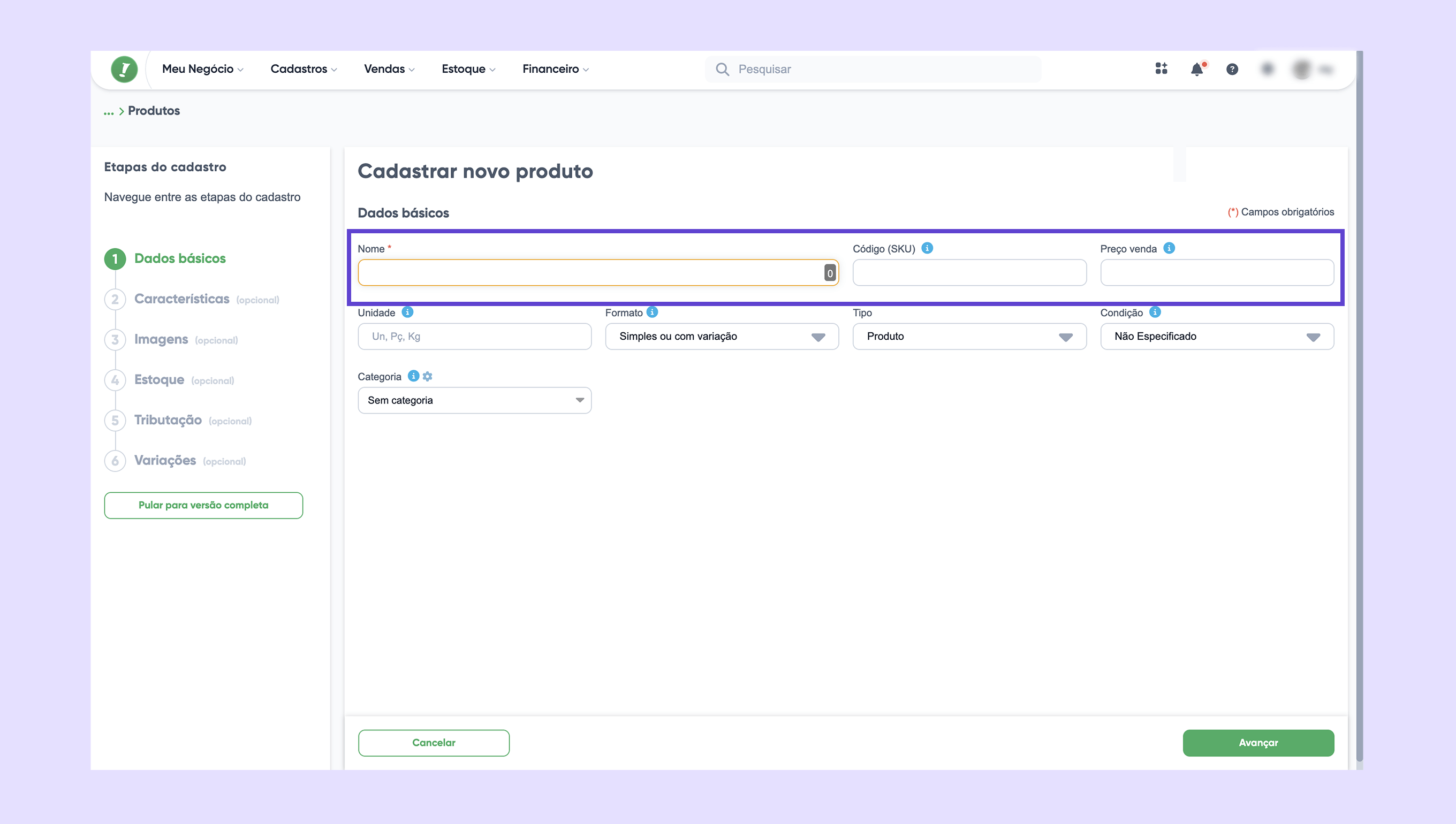 Preencha os campos obrigatórios — Nome, Código (SKU), e Preço venda. Opcional: adicione outros detalhes, se necessário.