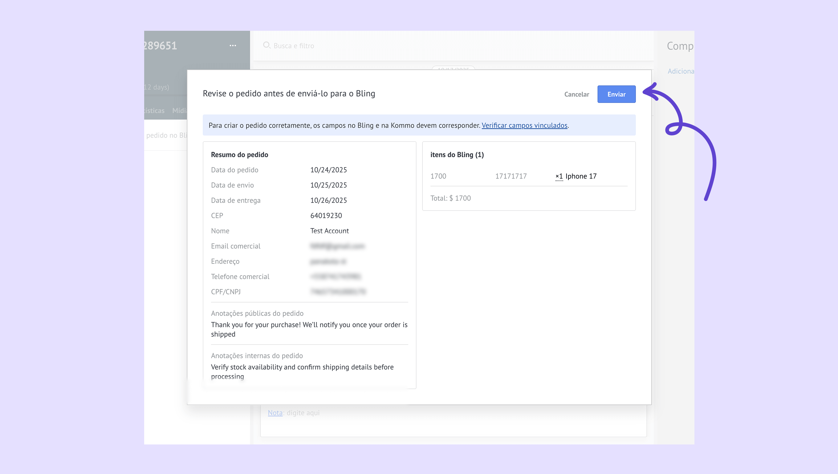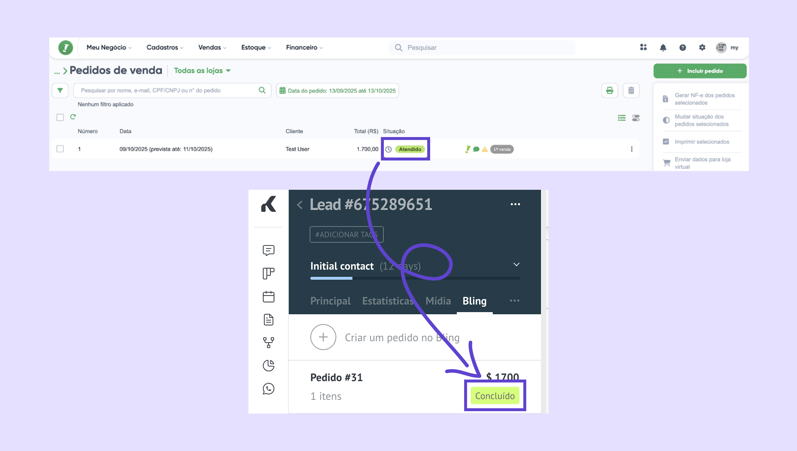 Assim que um pedido for criado, seu status no Bling será sincronizado automaticamente com a Kommo.