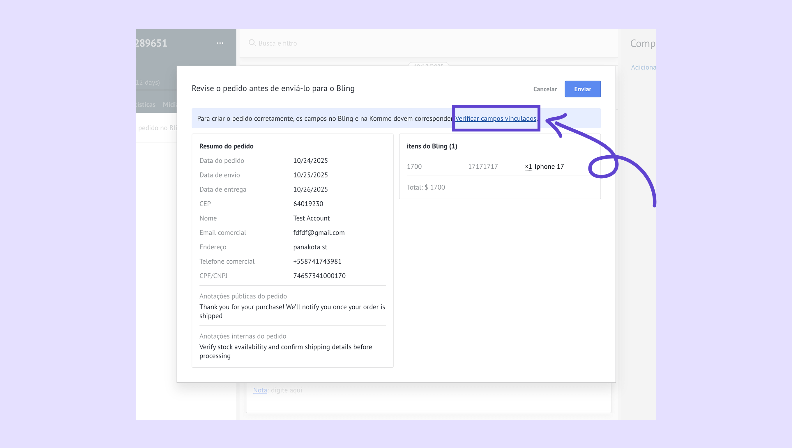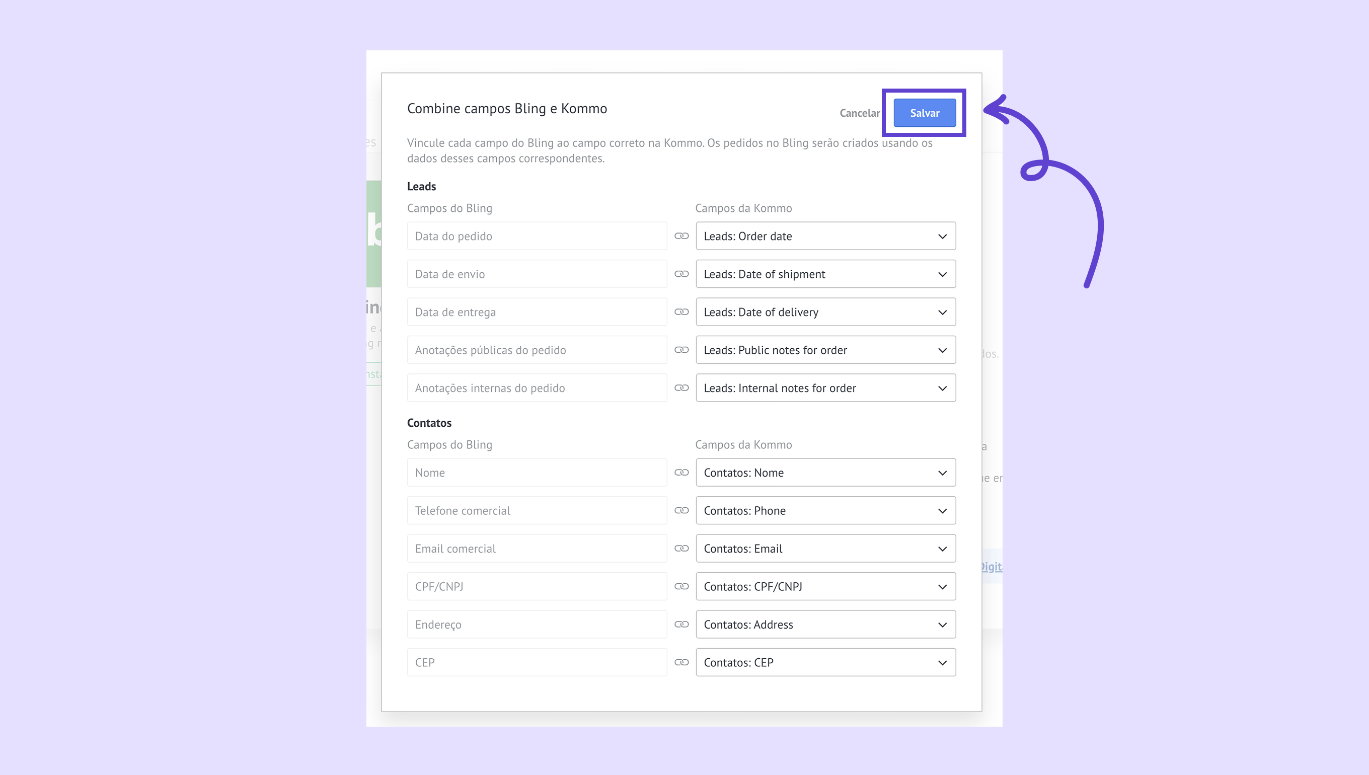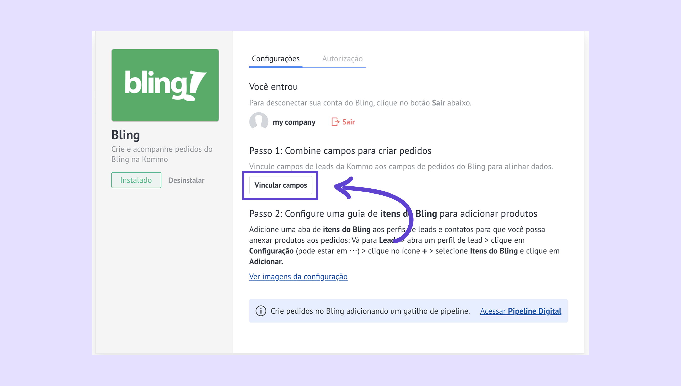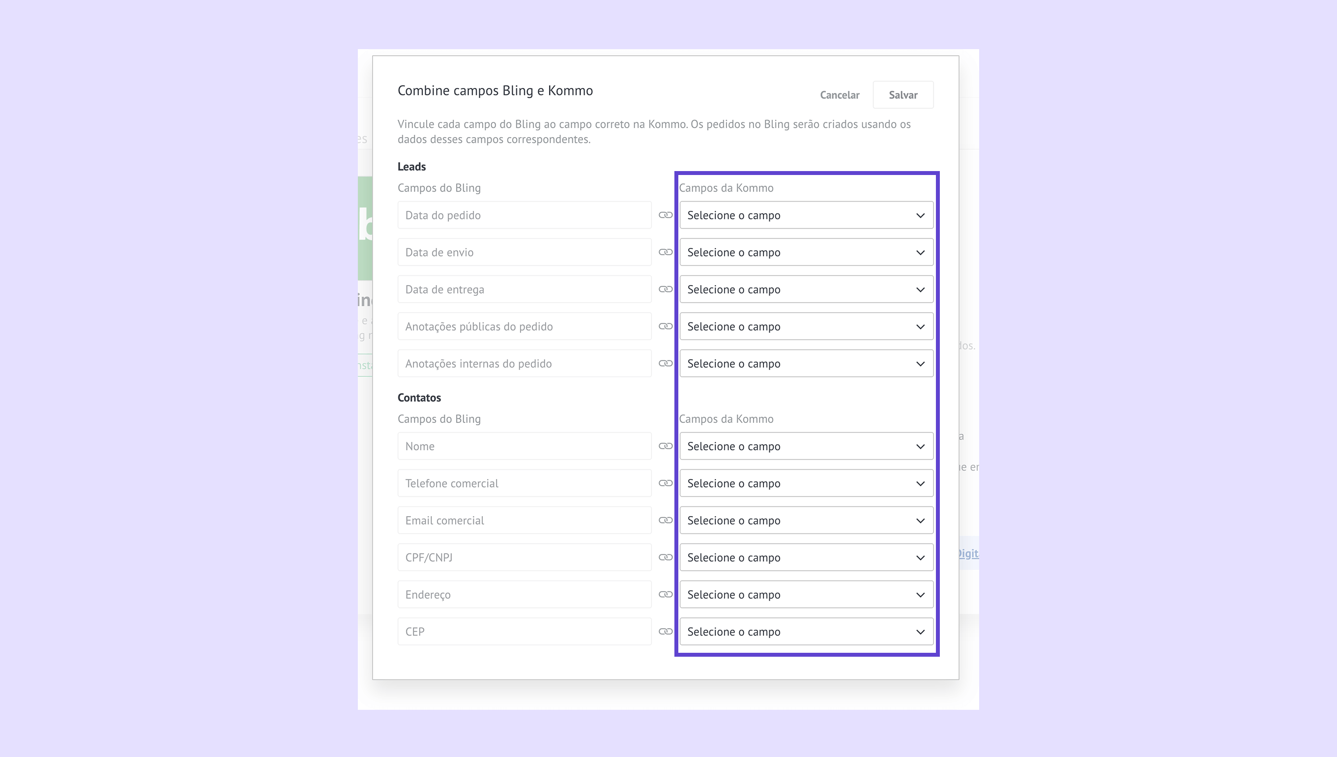 Vincular campos garante que seus dados da Kommo sejam transferidos corretamente para o Bling ao criar um pedido.