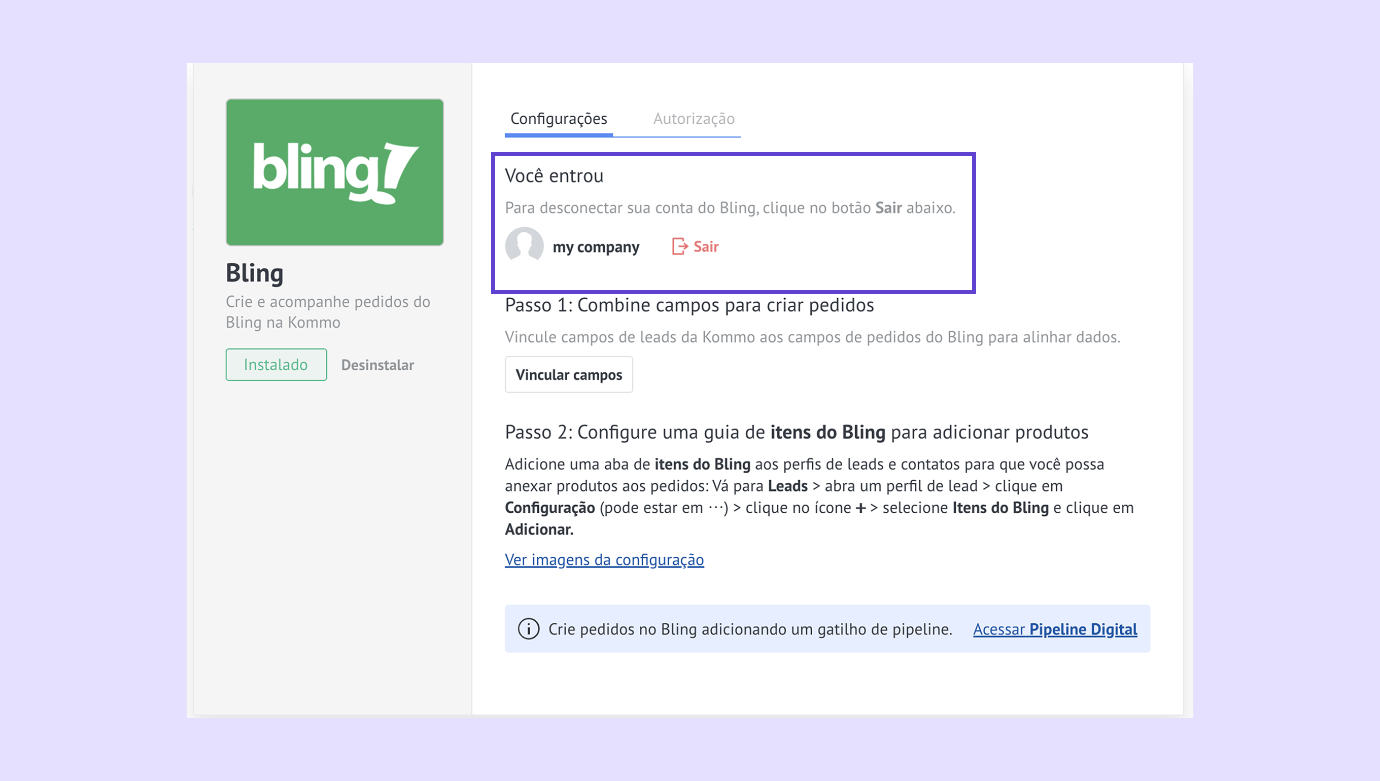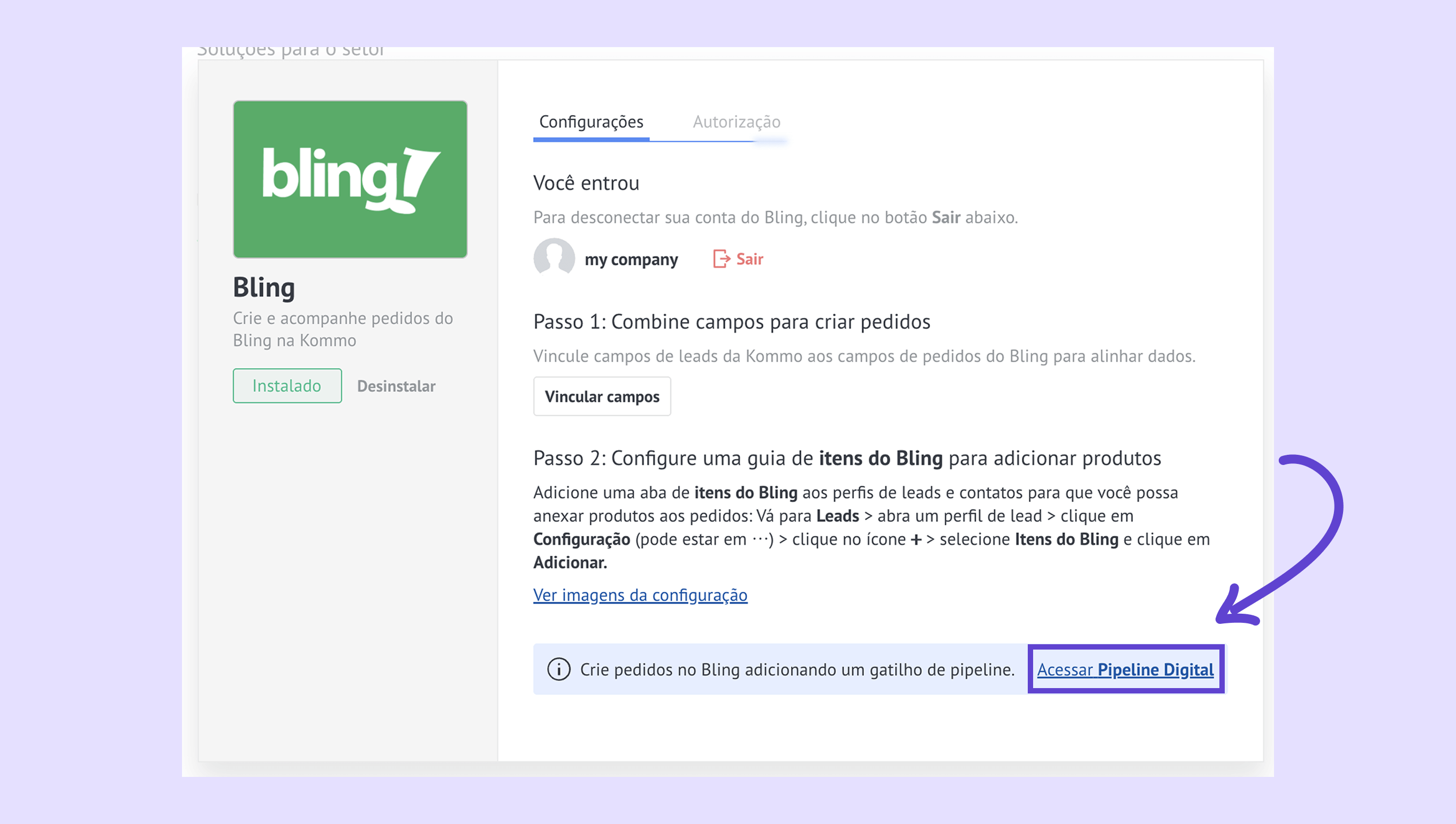 Clique em Ir para o Pipeline Digital (na integração com o Bling).