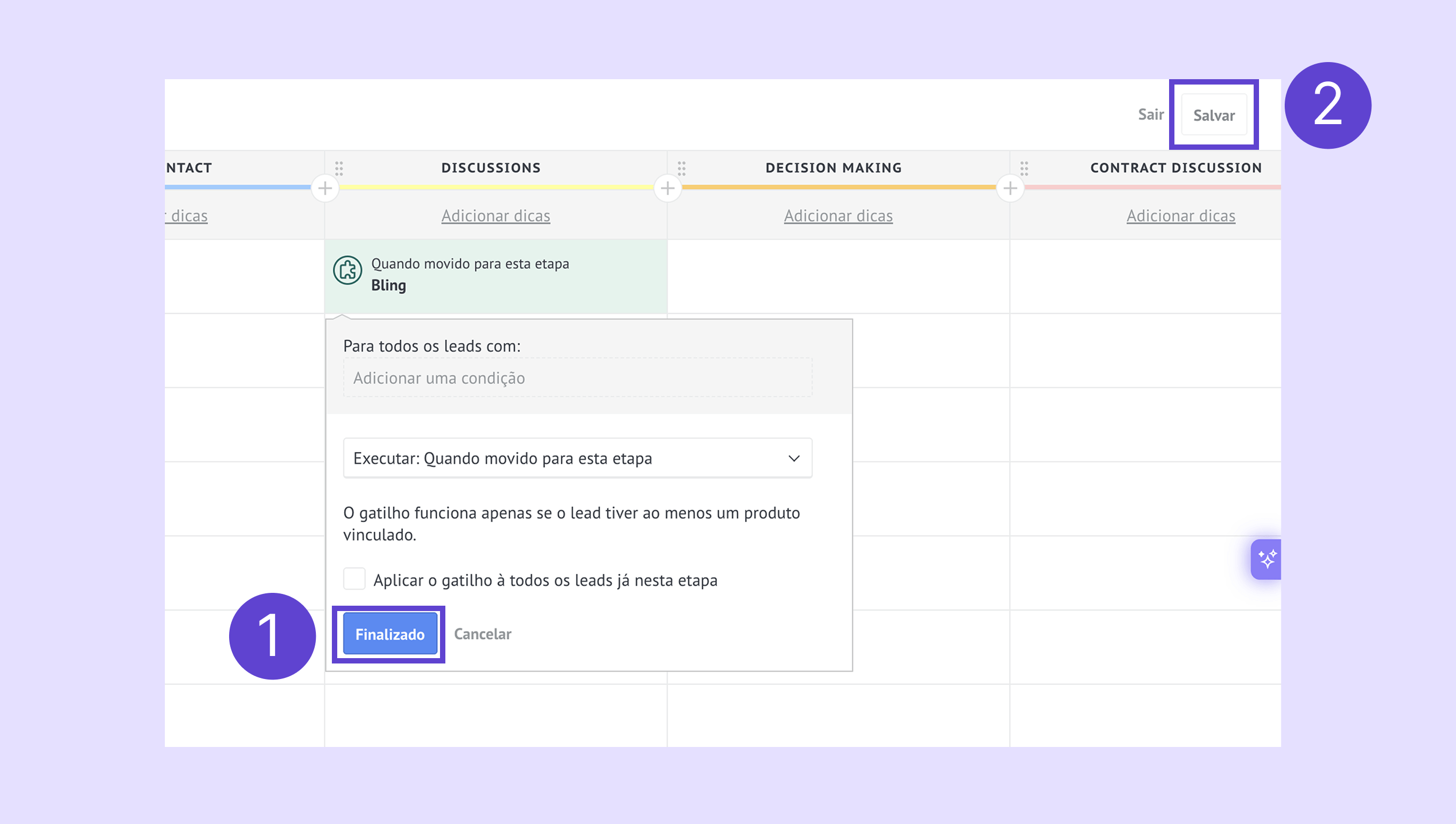 Mova o lead para a etapa com o gatilho do Bling e clique em Salvar.