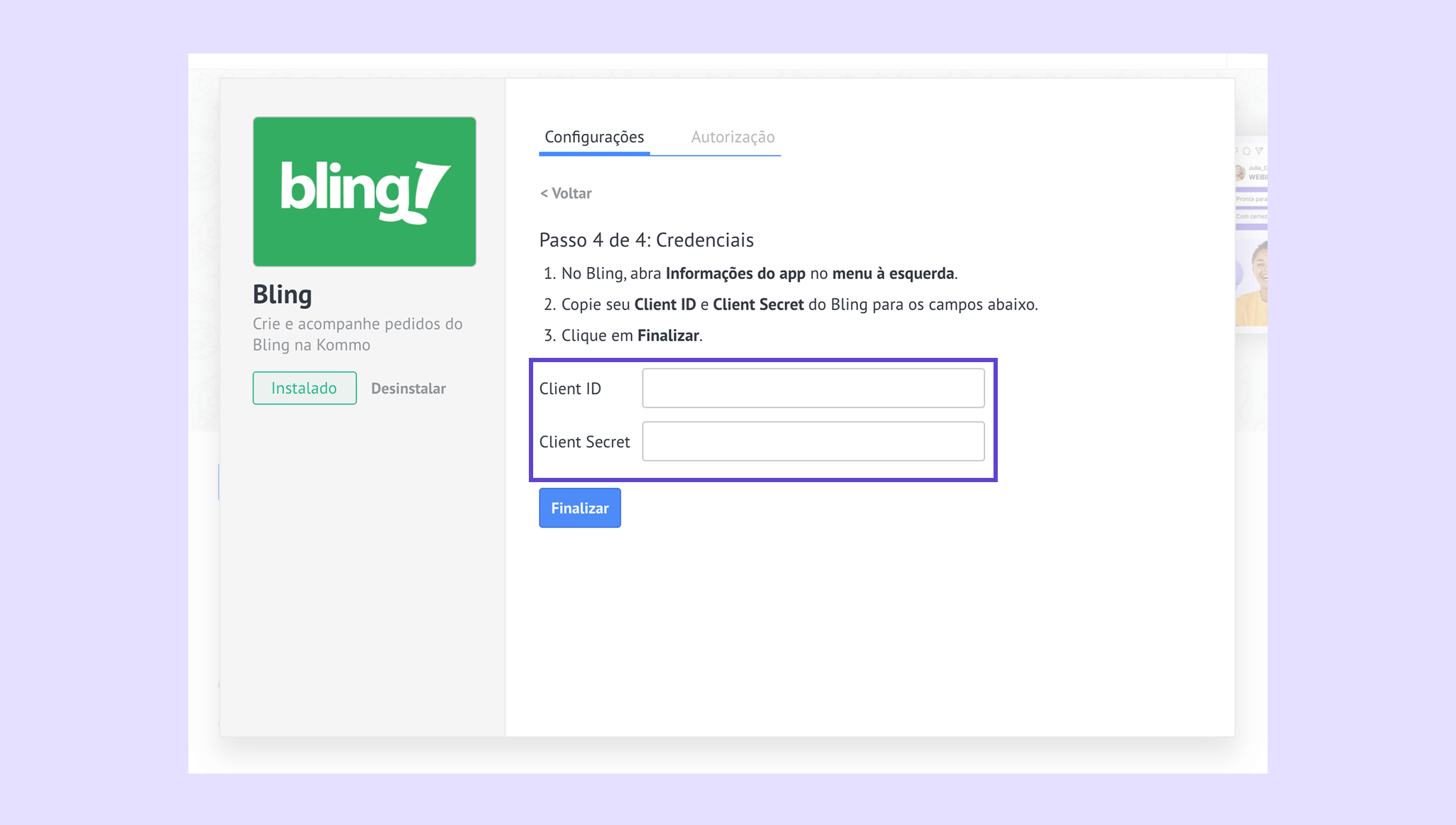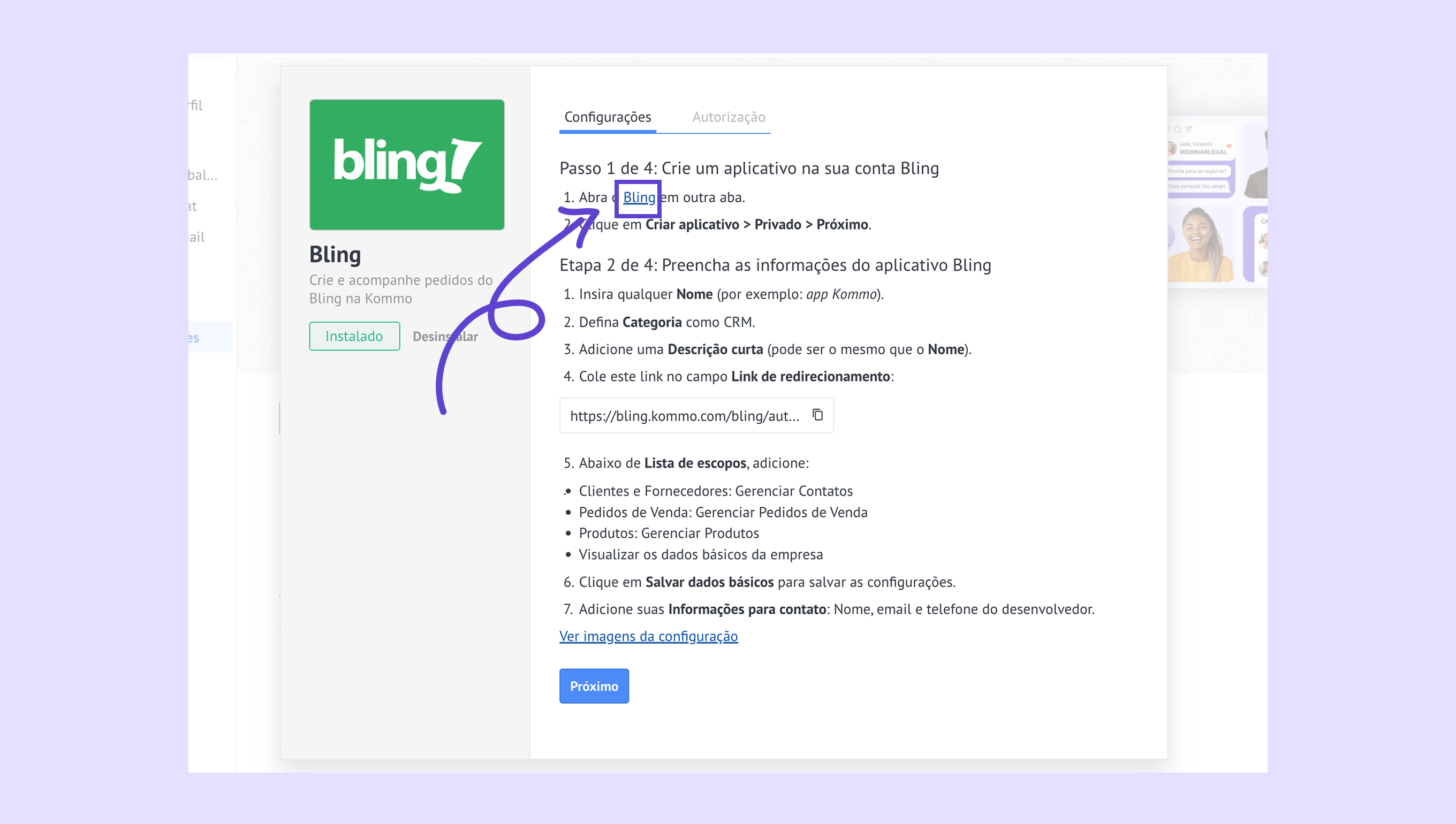 Antes de começar, certifique-se de já ter uma conta Bling. Na Kommo: