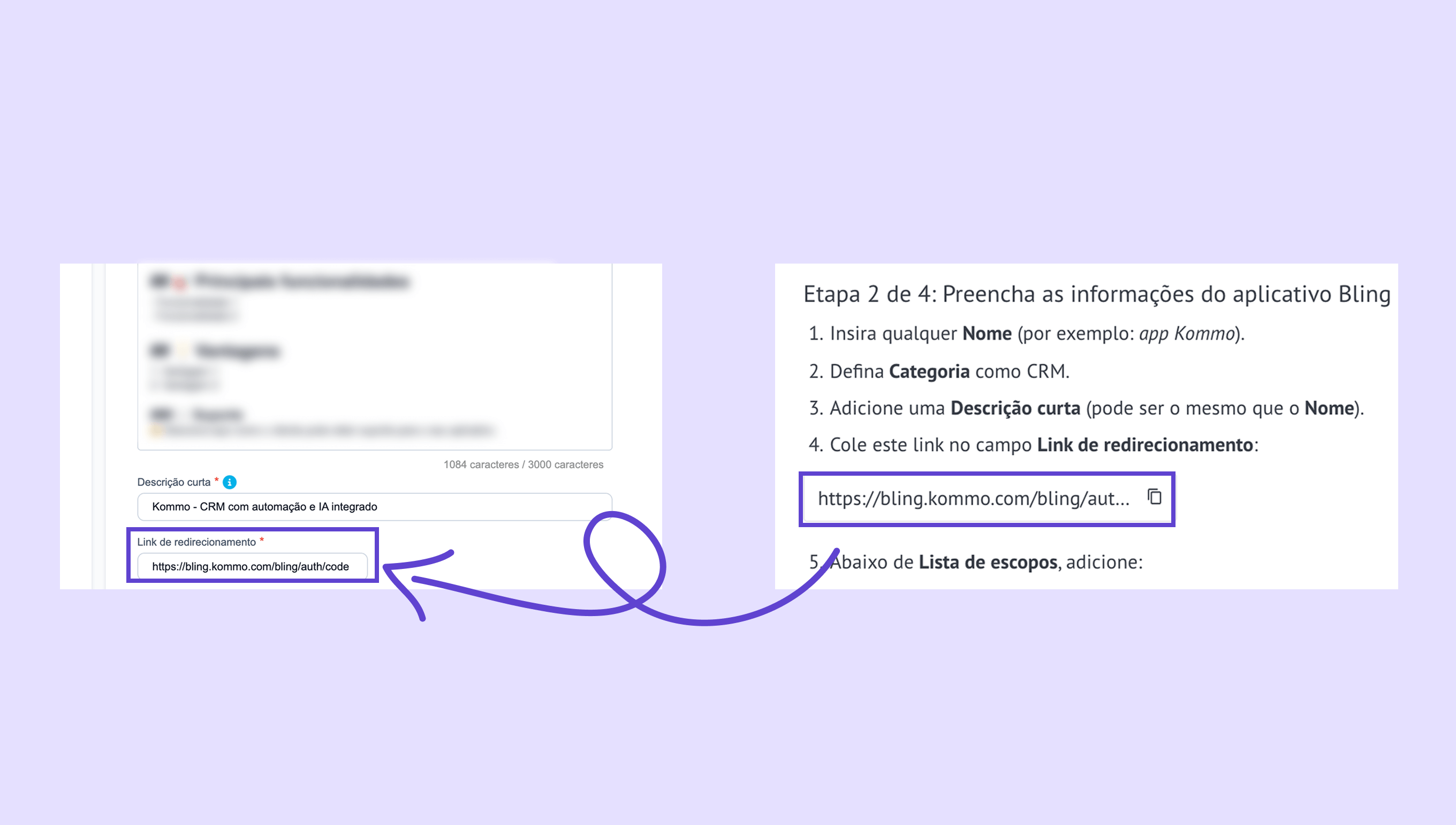 Em seguida, cole o link de redirecionamento da Kommo no campo Link de redirecionamento no Bling.