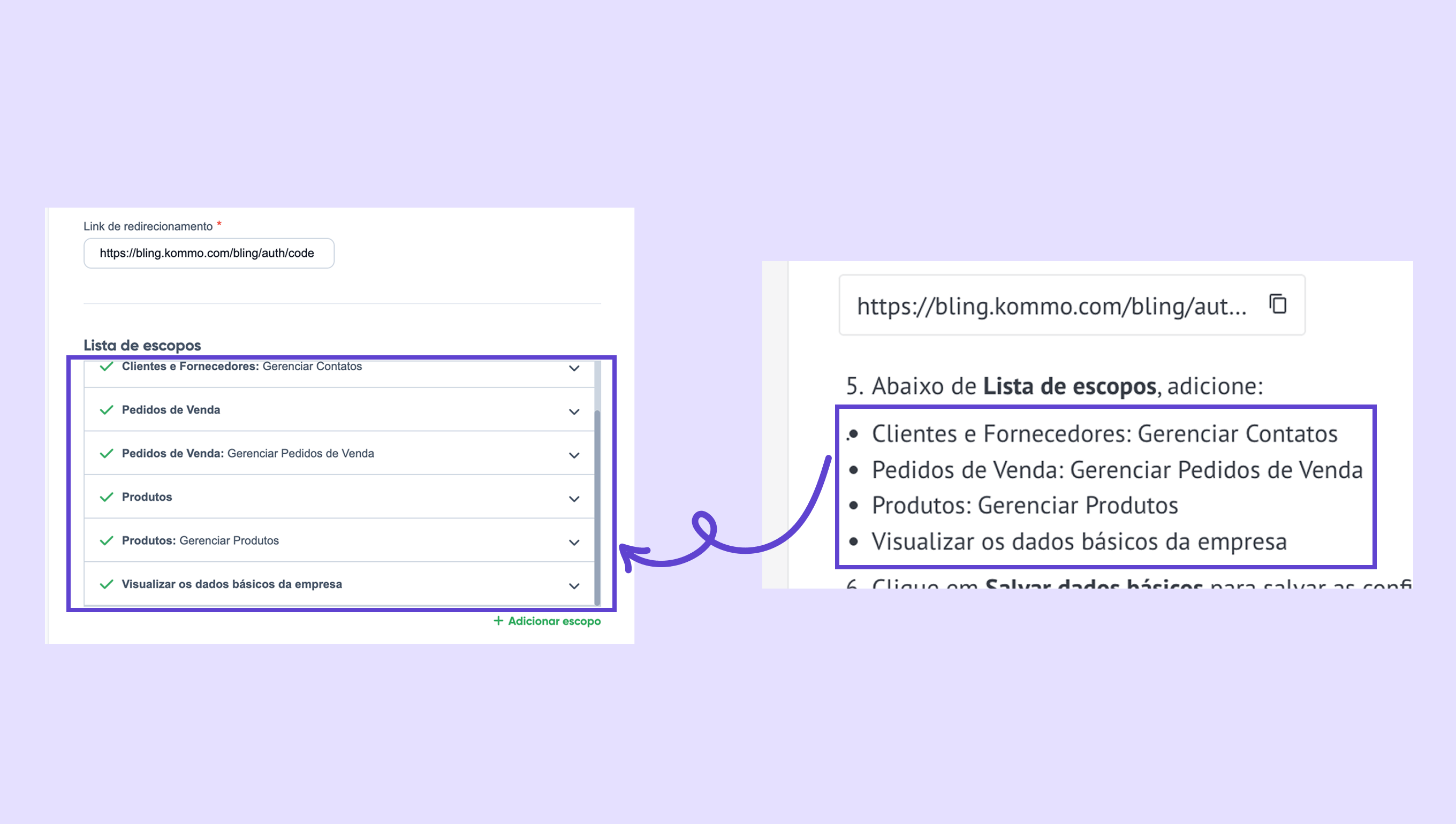 Em Lista de escopos, adicione os escopos mostrados no widget de integração.