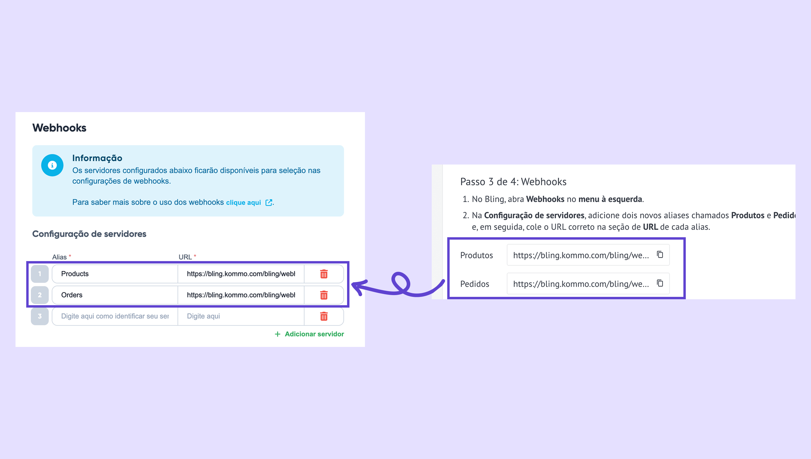 No menu à esquerda do Bling, acesse Webhooks → Configuração de servidores. Crie dois novos aliases chamados Produtos e Pedidos e, em seguida, cole os URLs do widget de integração nesses campos.
