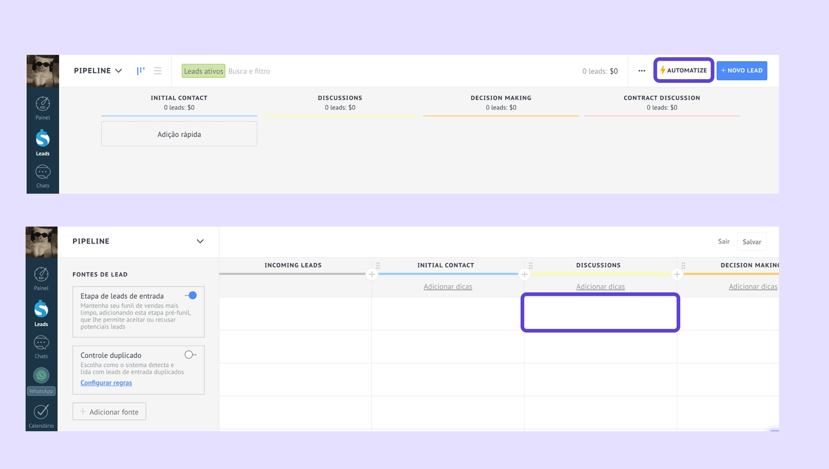 Ou você também pode acessar Leads → Automatizar. Em seguida, clique em + Adicionar gatilho na etapa do pipeline em que deseja que o gatilho funcione.