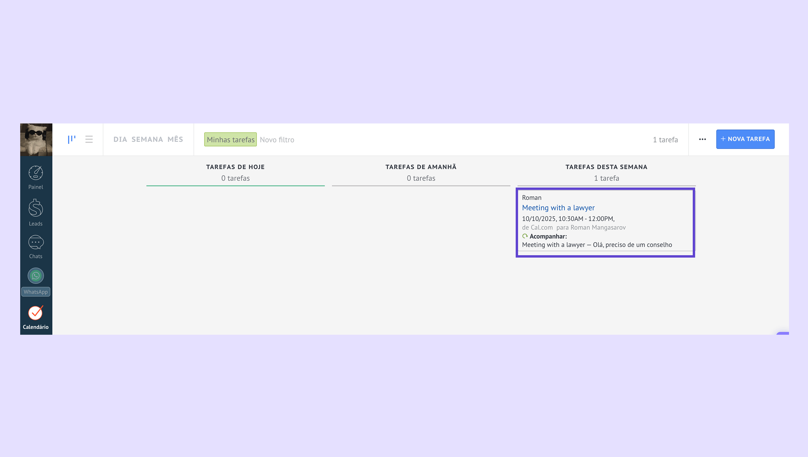 Todas as tarefas da Cal.com também aparecem na seção Calendário da Kommo.