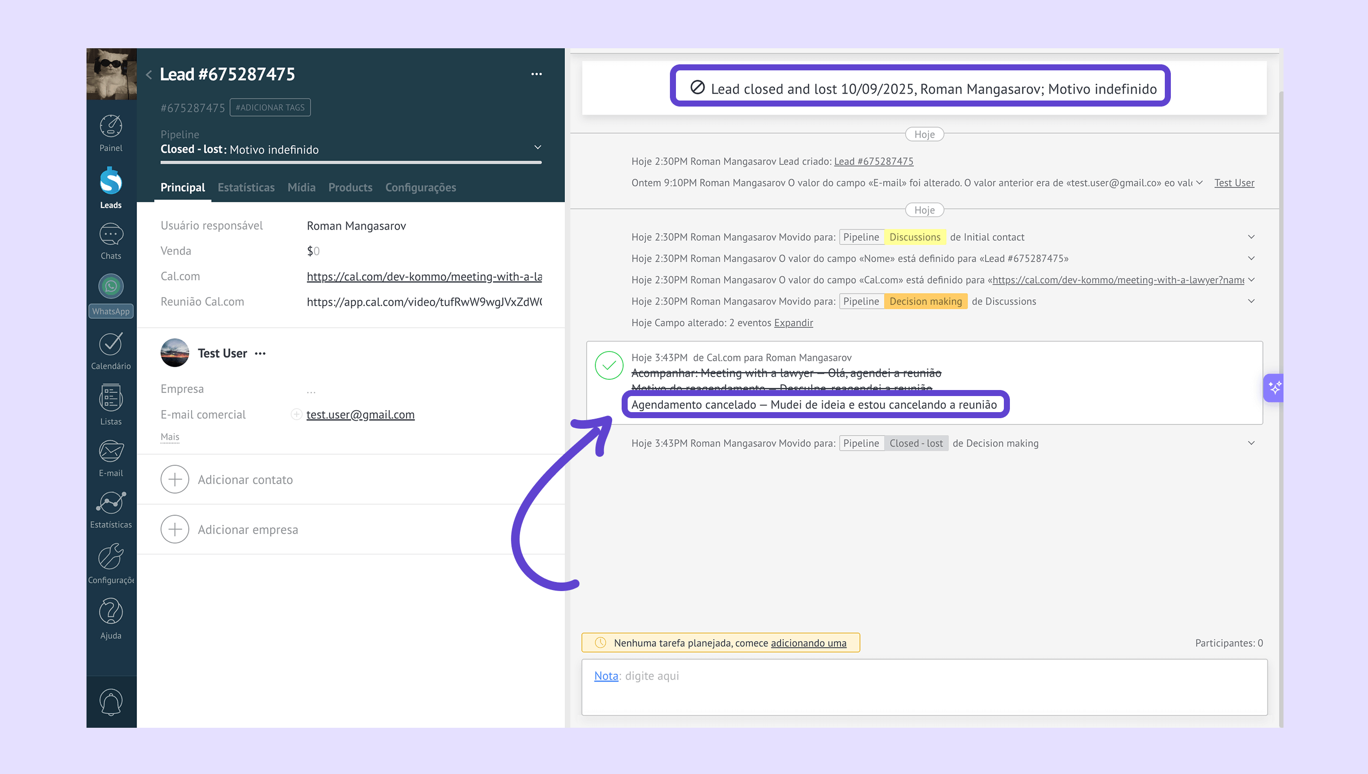 Se um cliente cancelar a reunião, a tarefa na Kommo será marcada como concluída. Você verá Reserva cancelada junto com a mensagem do cliente, e o lead passará automaticamente para a etapa Fechado-perdido.