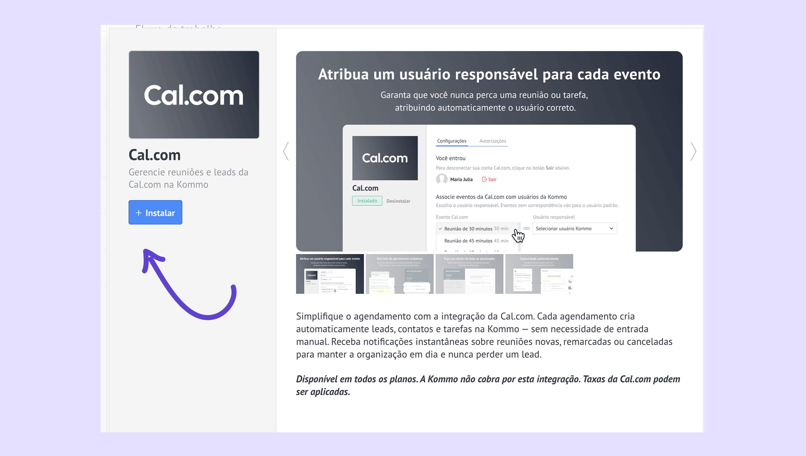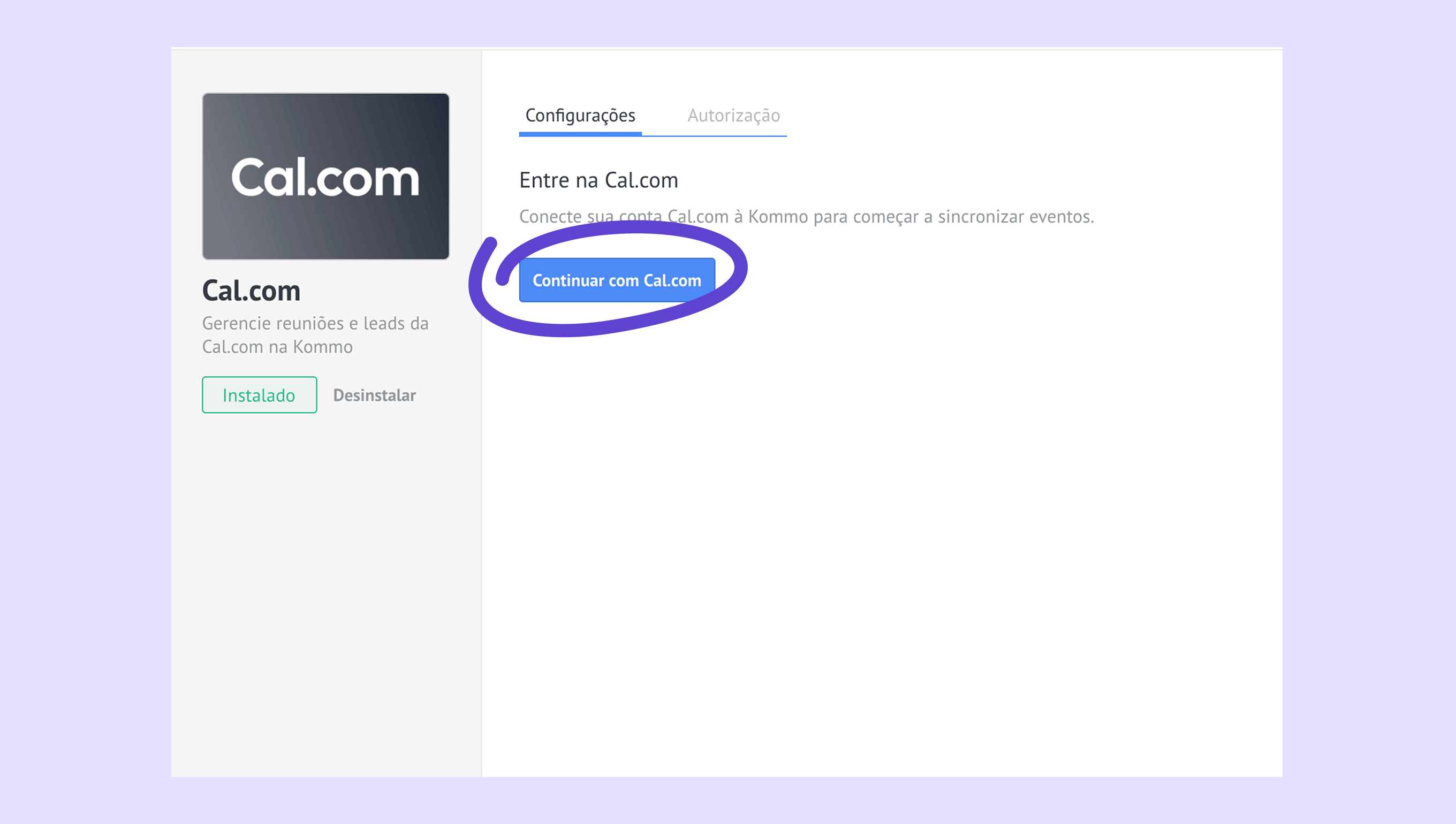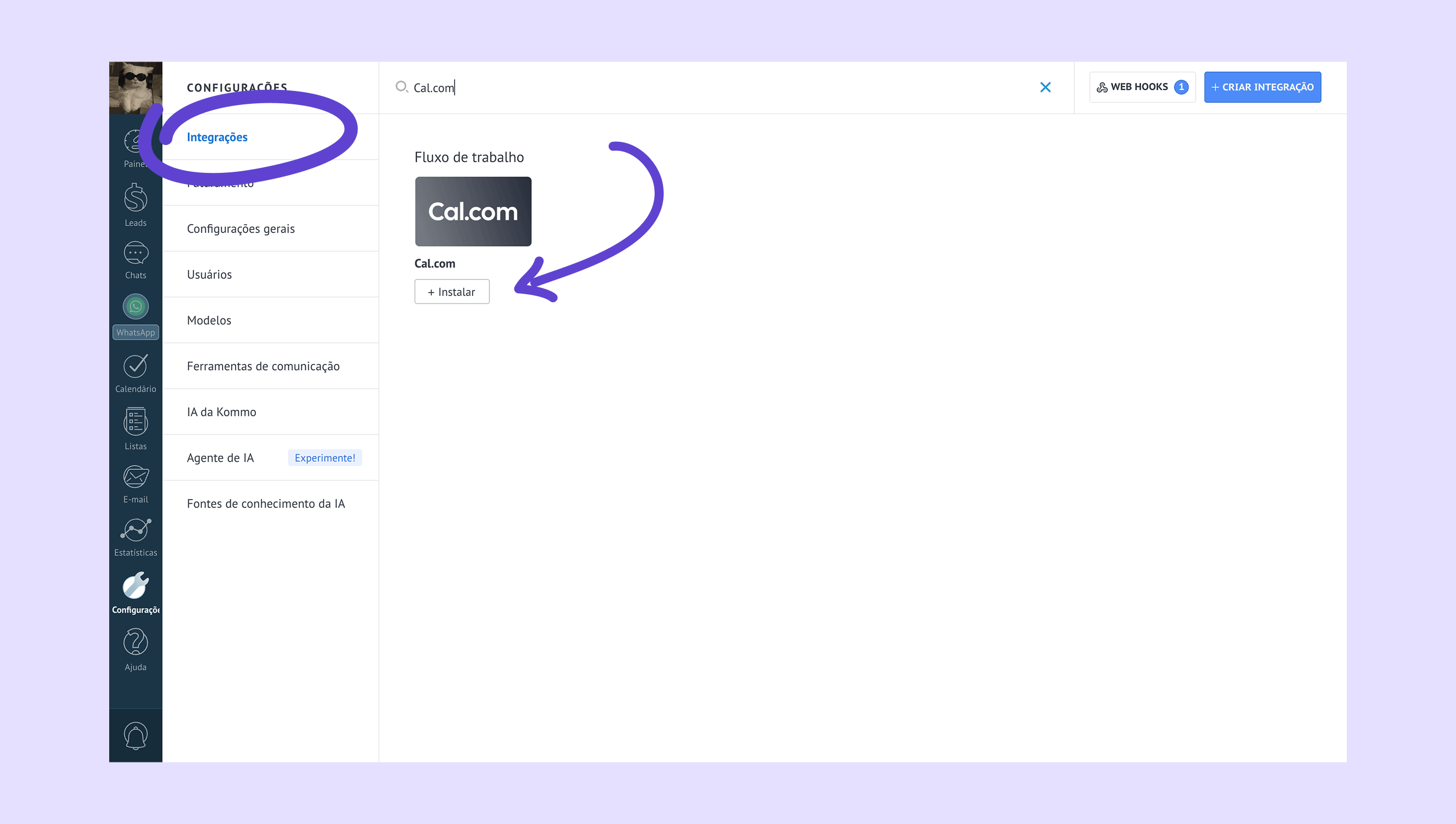 Primeiro, certifique-se de ter uma conta na Cal.com — você pode criar uma aqui. Depois, no Kommo, basta seguir estes passos para conectar a integração: